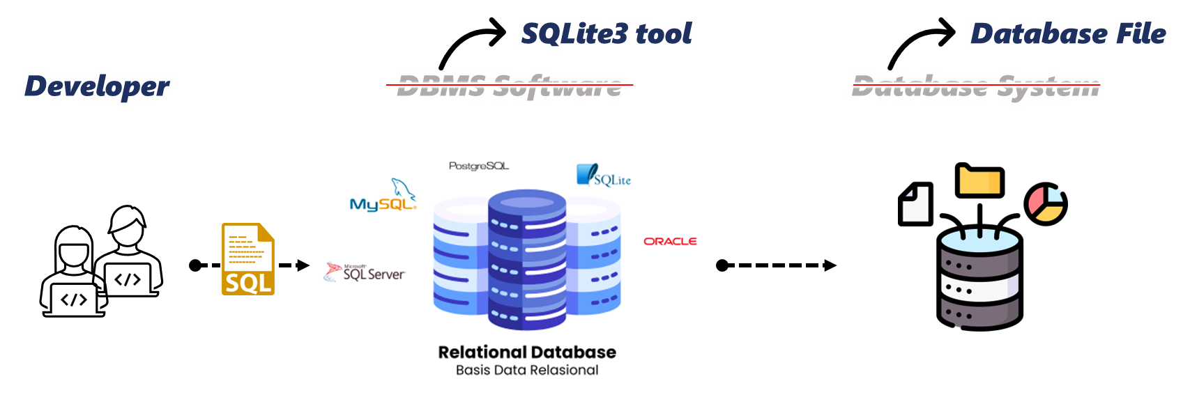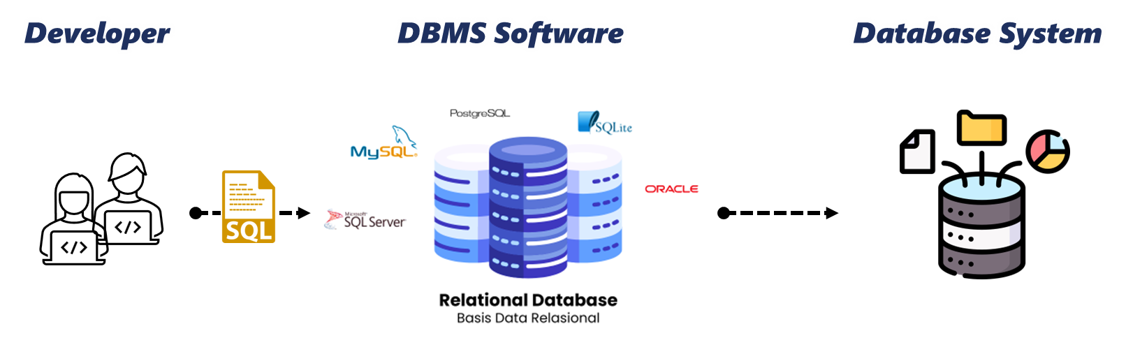 데이터베이스 관리자(DBA)와 응용 소프트웨어 개발자(ASD)는 이미지 같이 서버 컴퓨터에 실행중인 DBMS 프로그램에 접근하여 SQL을 이용해서 Database에 Table 형태로 Data를 다루는 법을 학습합니다.