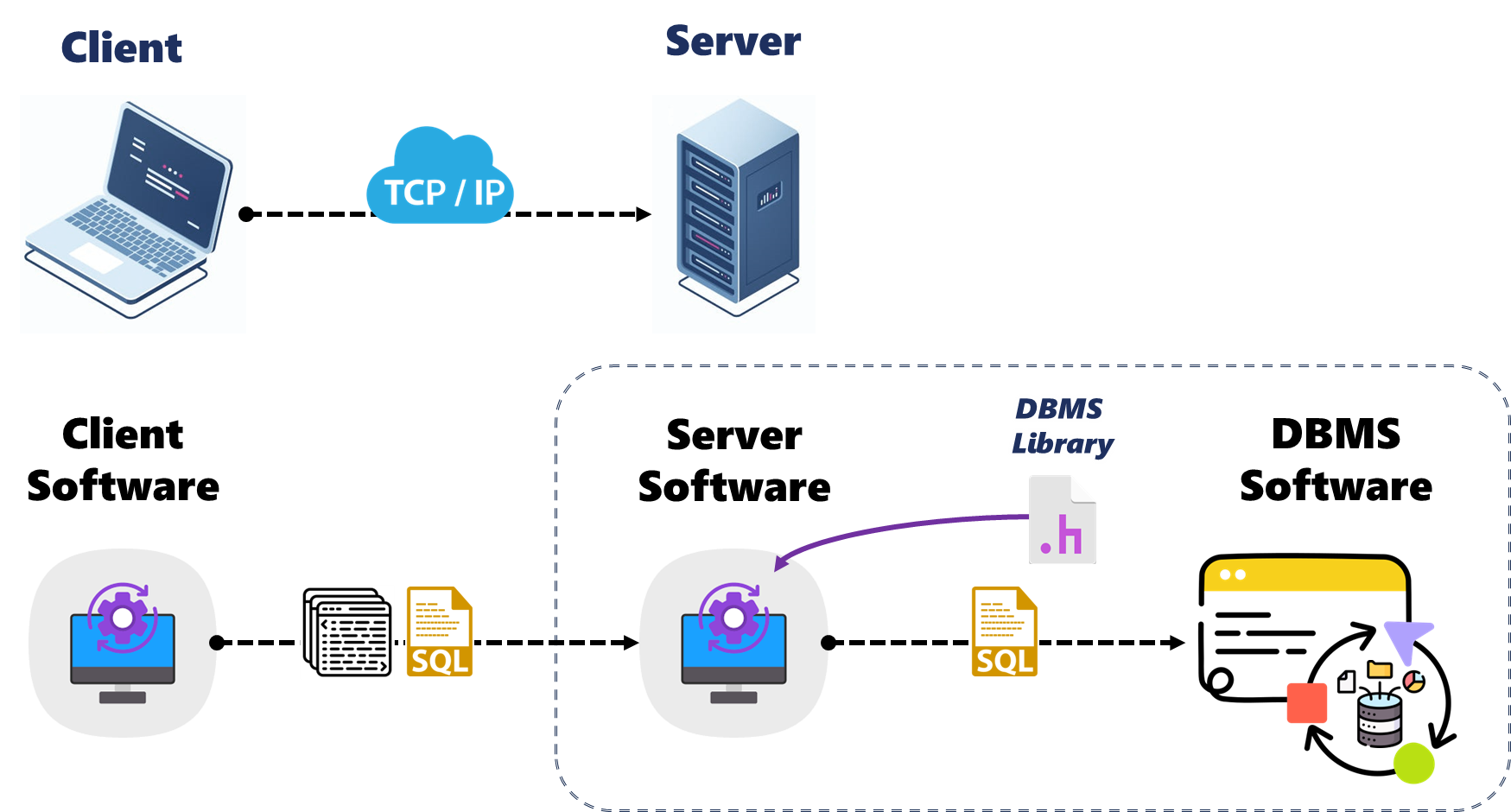 서버 컴퓨터의 소프트웨어는 필요한 경우에, 동작중인 DBMS 소프트웨어에 SQL을 전달하여 Database를 처리합니다.