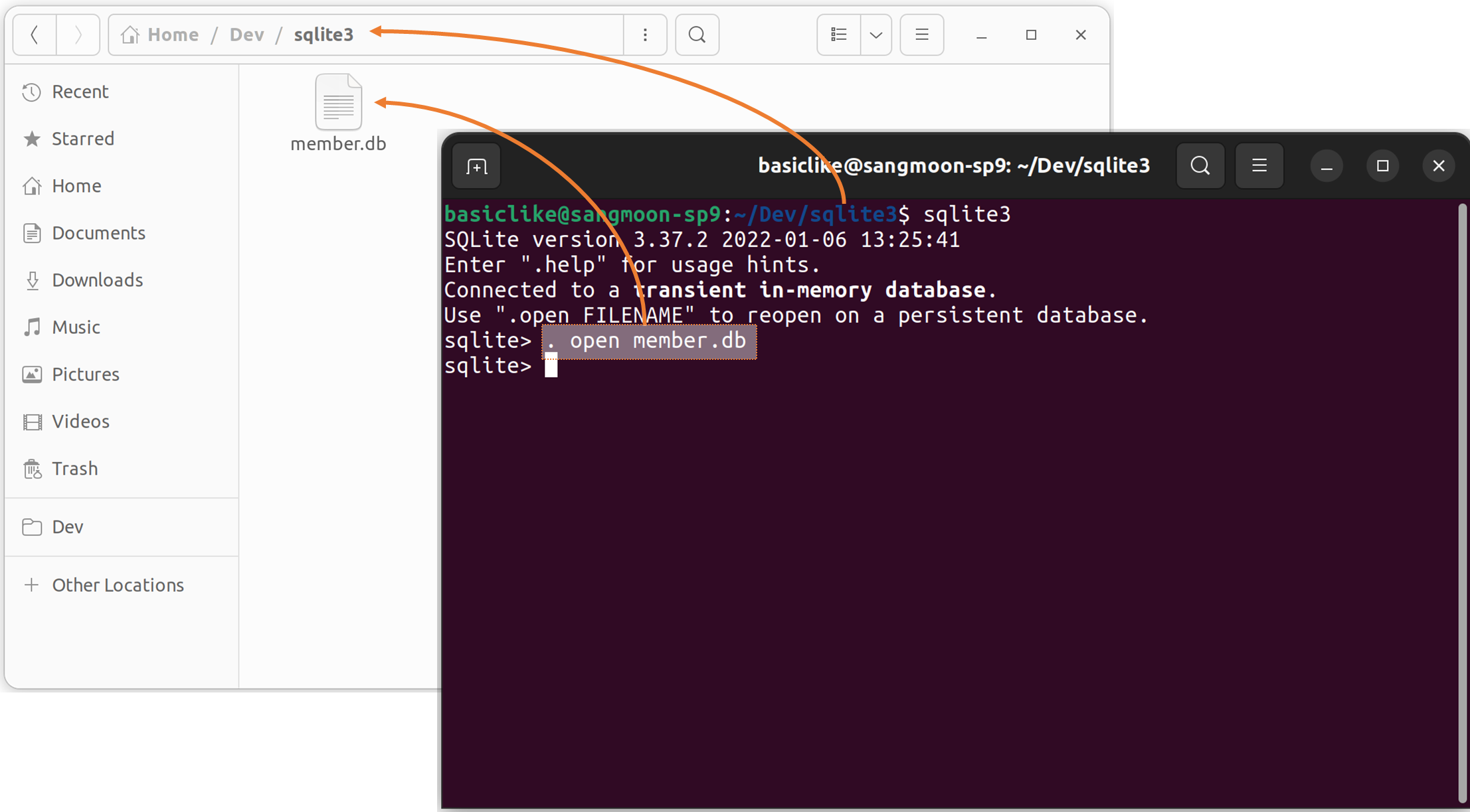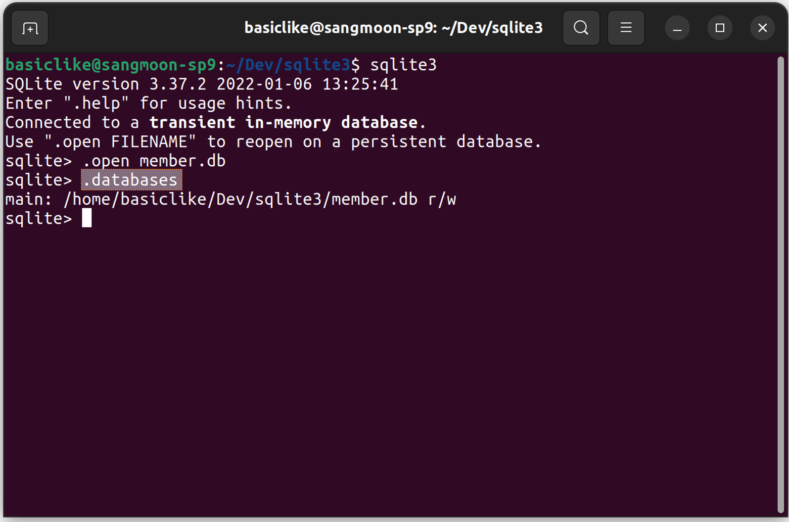.open <databse name>.db 명령어를 사용 DB 파일 생성