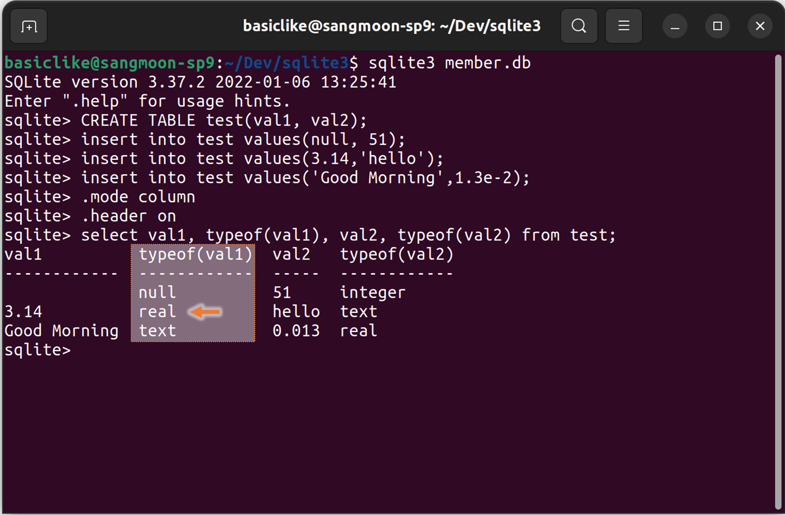 | REAL | REAL 타입의 컬럼에 INTEGER 값이 포함 된 경우 REAL 타입으로 변환되어 저장한다. |
