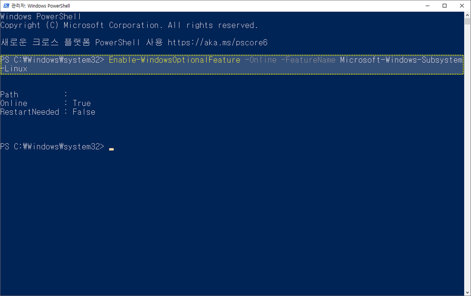 $ Enable-WindowsOptionalFeature -Online -FeatureName Microsoft-Windows-Subsystem-Linux
