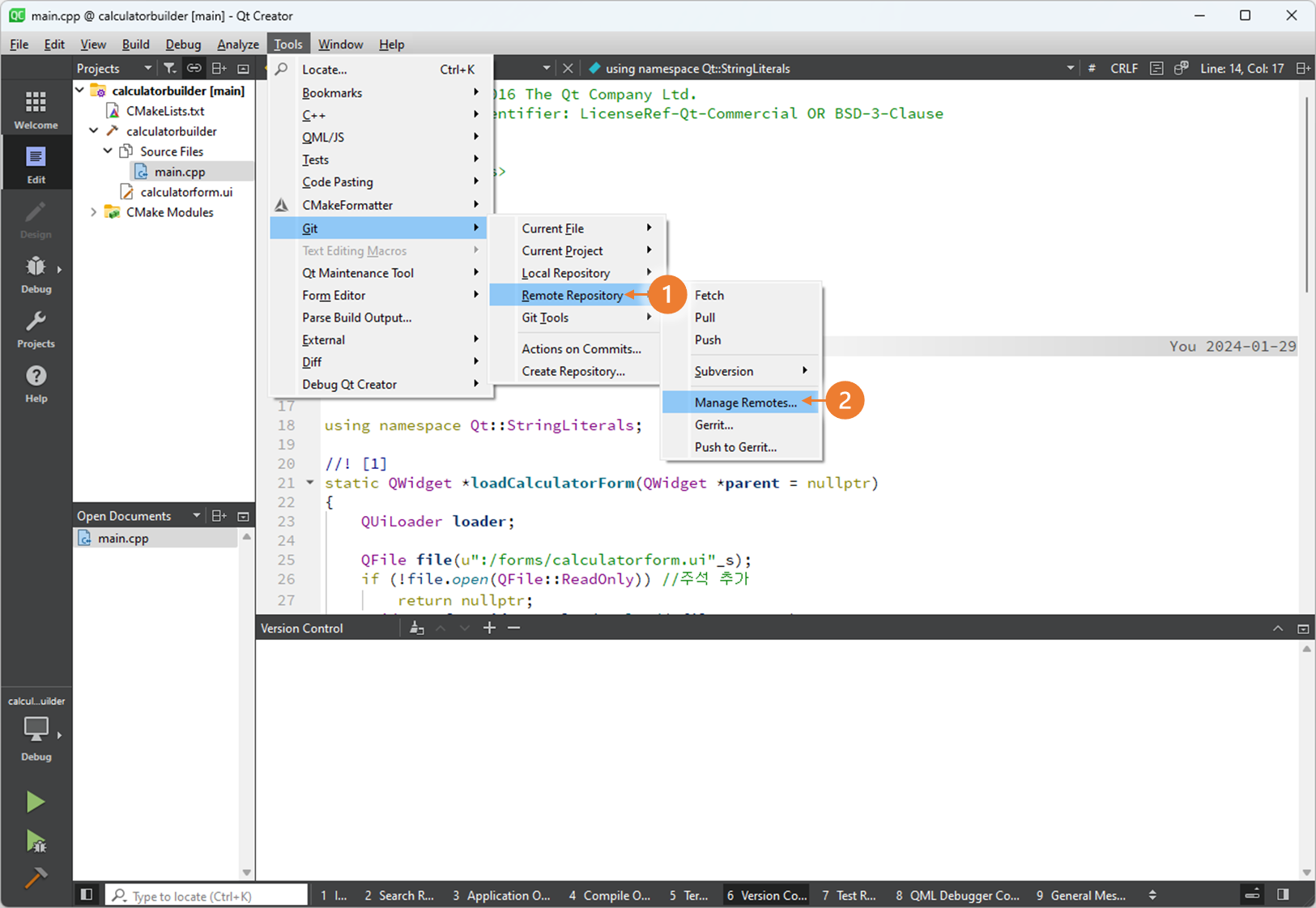내 작업환경에 Git이 설치되어 있다면, Qt Creator에서 Git 메뉴를 선택할 수 있습니다.