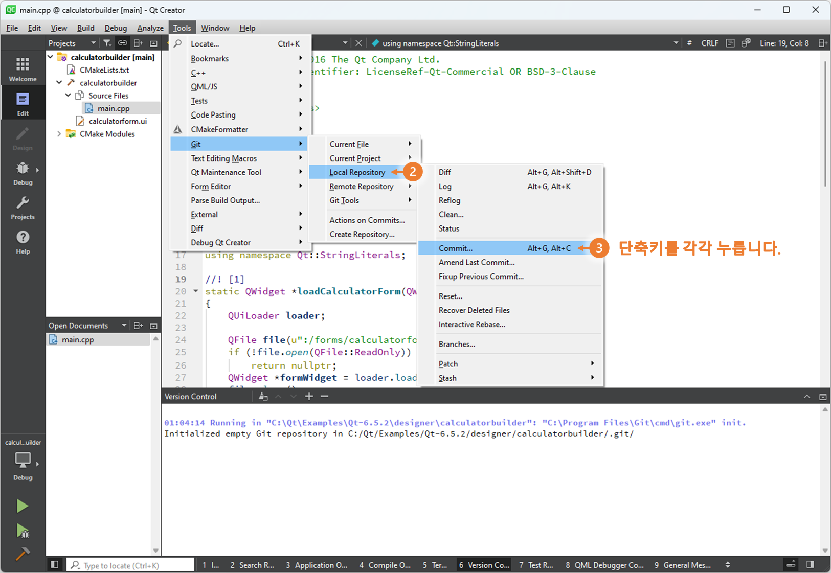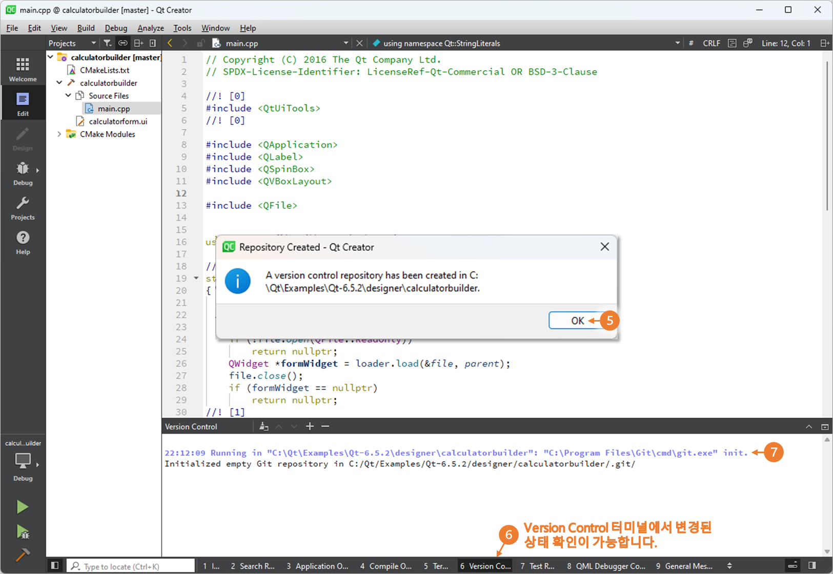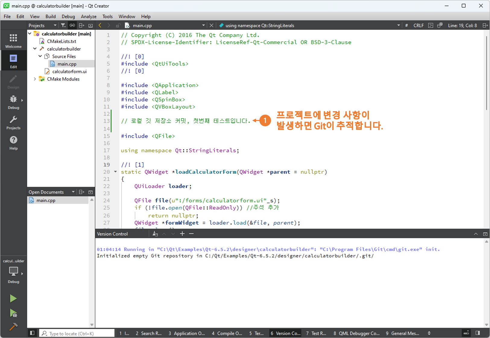 Qt Creator 에서, 프로젝트 변경 사항을 Git이 추적하도록, 프로젝트 경로에 로컬 Git 저장소를 생성합니다.