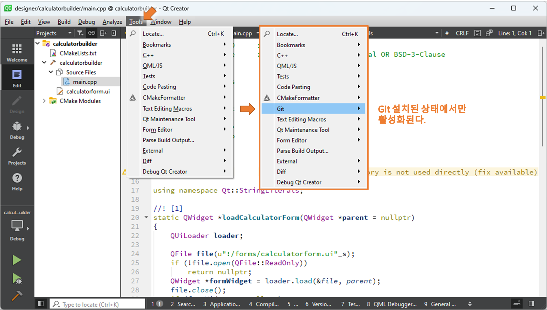 아래 이미지 처럼 Qt Creator 의 Tools 메뉴에서 Git 메뉴가 보이지 않는다면, 윈도우에 Git 설치를 먼저 진행합니다.