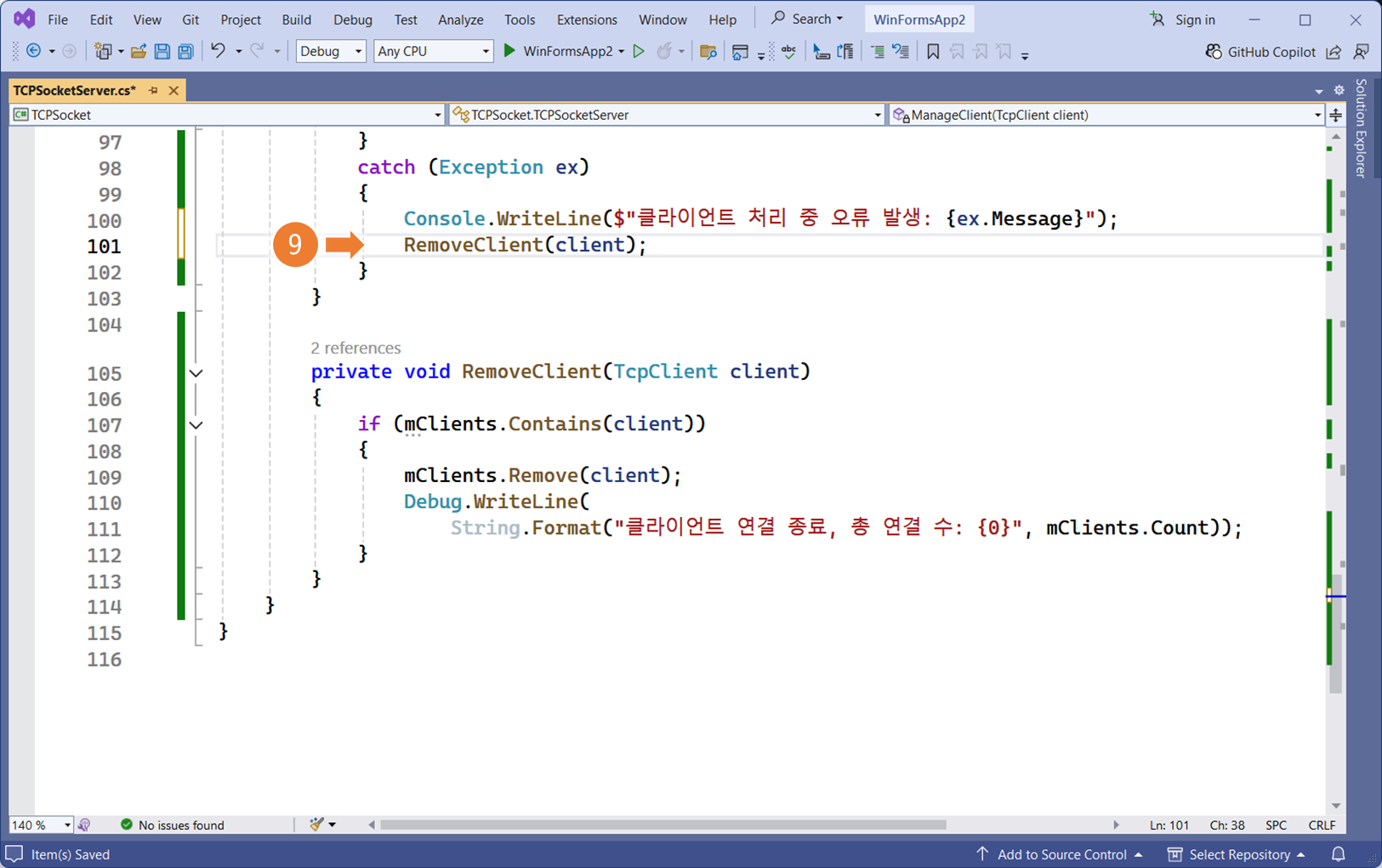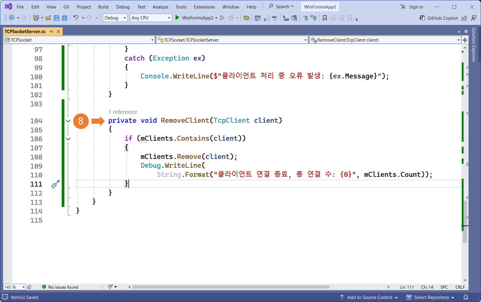 String.Format("클라이언트 연결 종료, 총 연결 수: {0}", mClients.Count));
