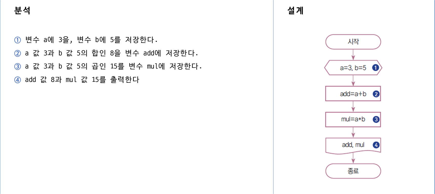 3을 변수 a에, 5를 변수 b에 저장합니다. 그리고 두 수를 더한 값은 add에, 곱한 값은 mul에 저장합니다.