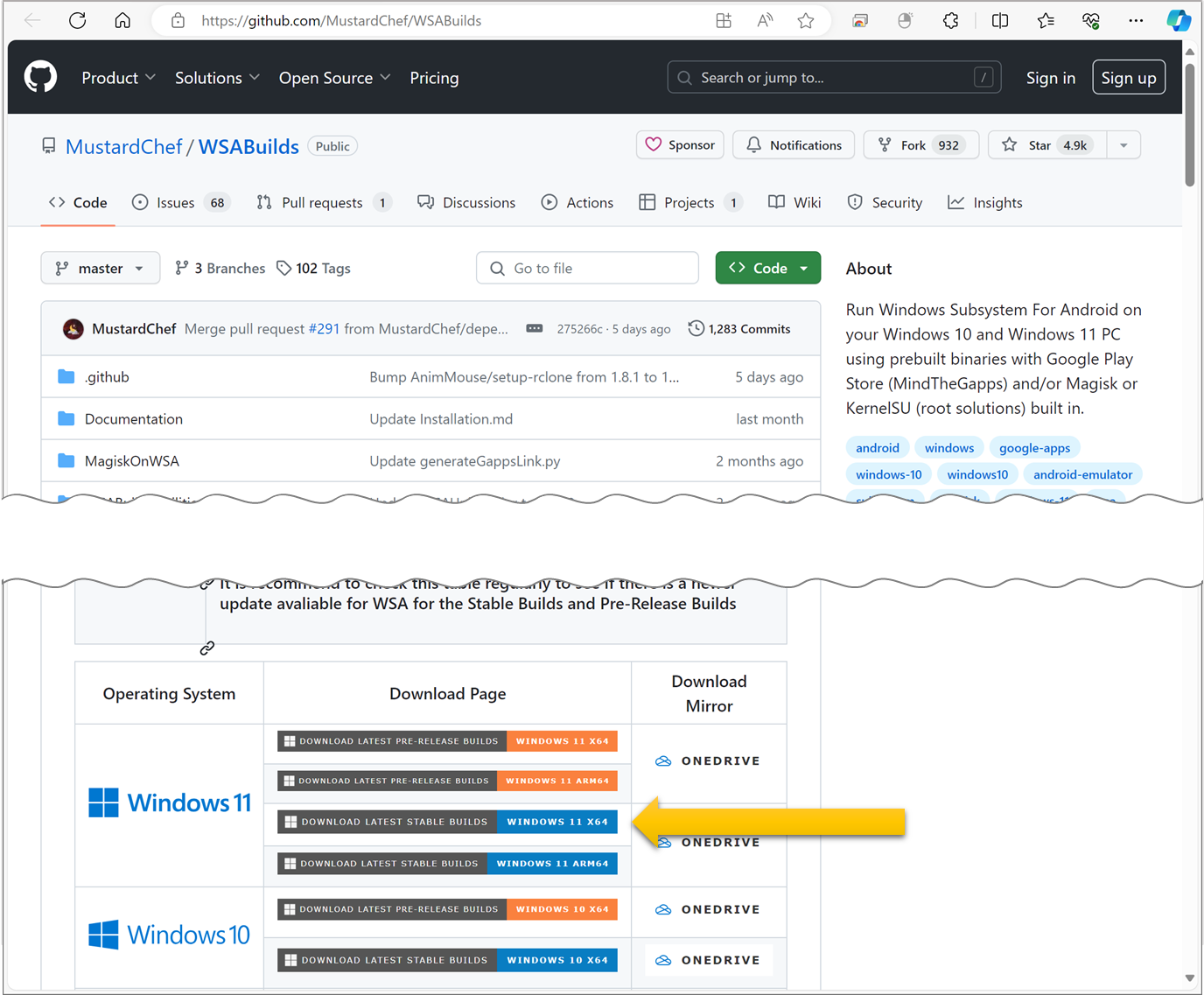1. MustardChef/WSABuilds github 다운로드 링크 이동