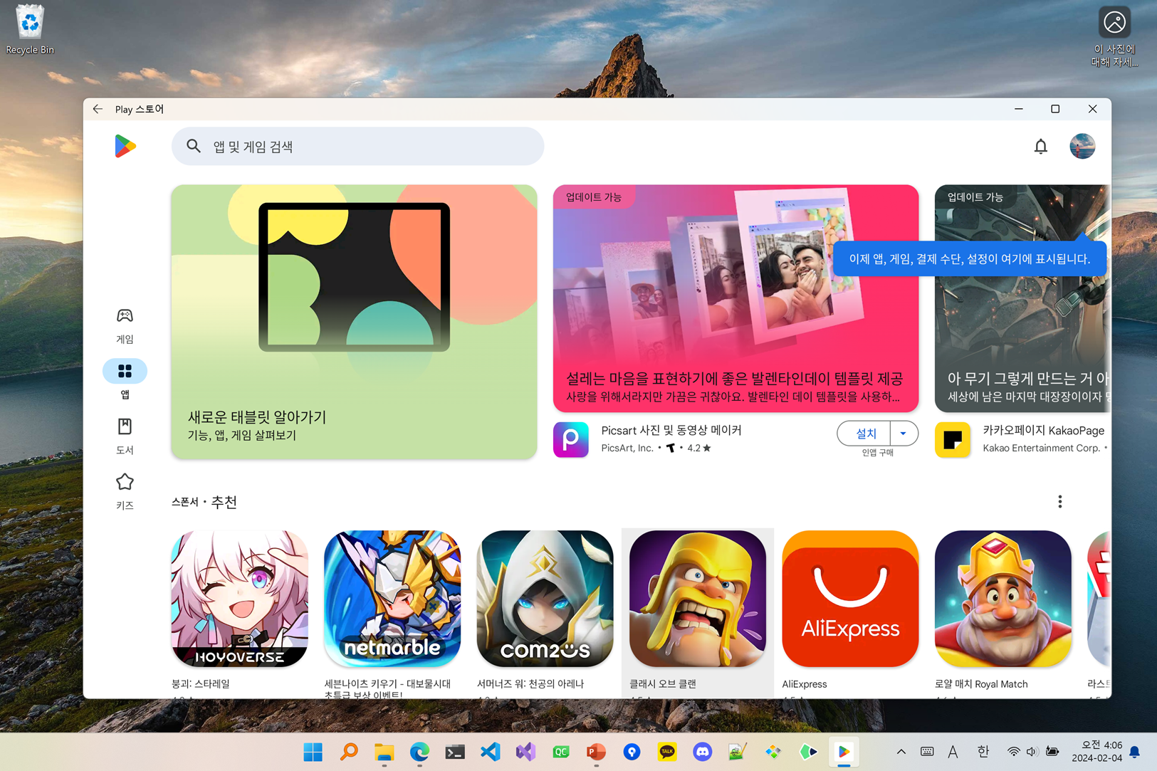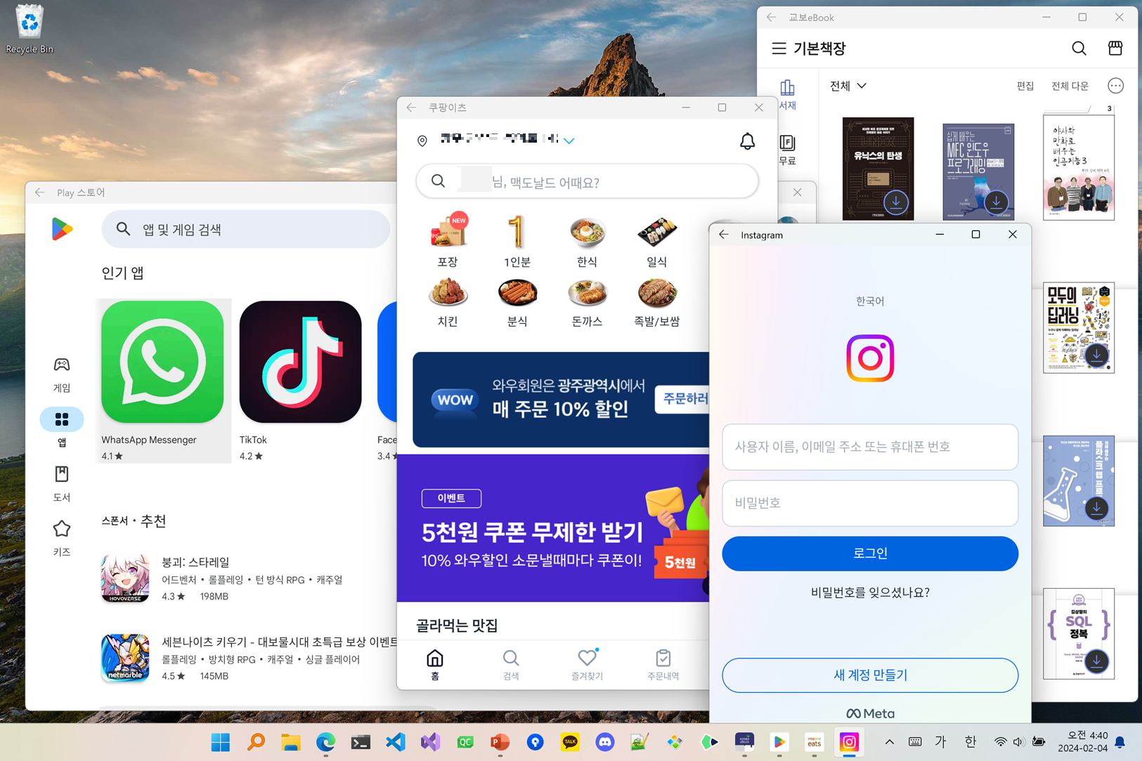 Windows Subsystem for Android (WSA): 윈도우에 안드로이드 스토어와 어플리케이션 사용 가능하다.