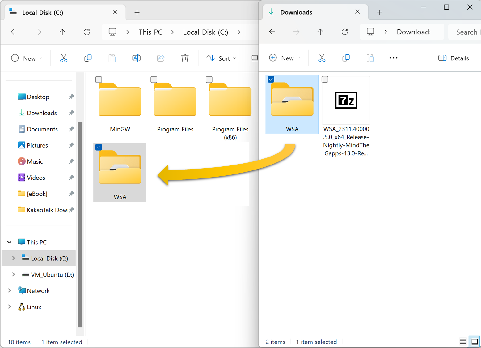2. 폴더 이름을 WSA로 변경 후, 루트 폴더로 이동