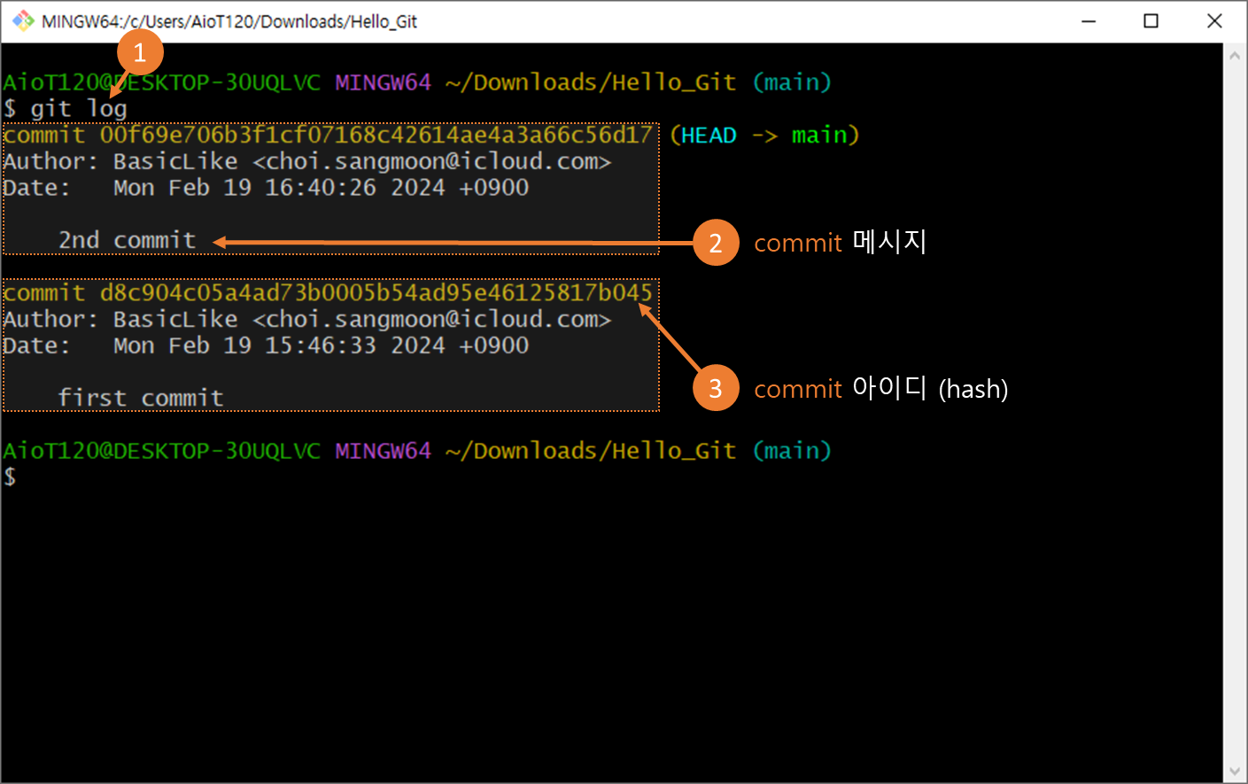 ③각 commit은 사용자가 입력한 메시지 이외에, 헤시 코드를 아이디로 가집니다.
