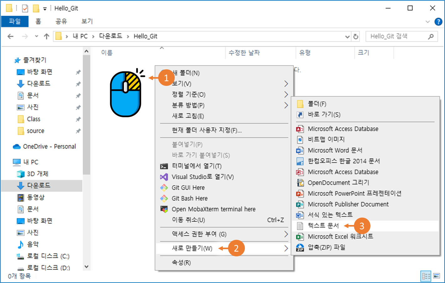 파일 탐색기에서 ①마우스 오른쪽 버튼을 클릭하고 ②새로 만들기 > ③텍스트 문서를 클릭합니다.