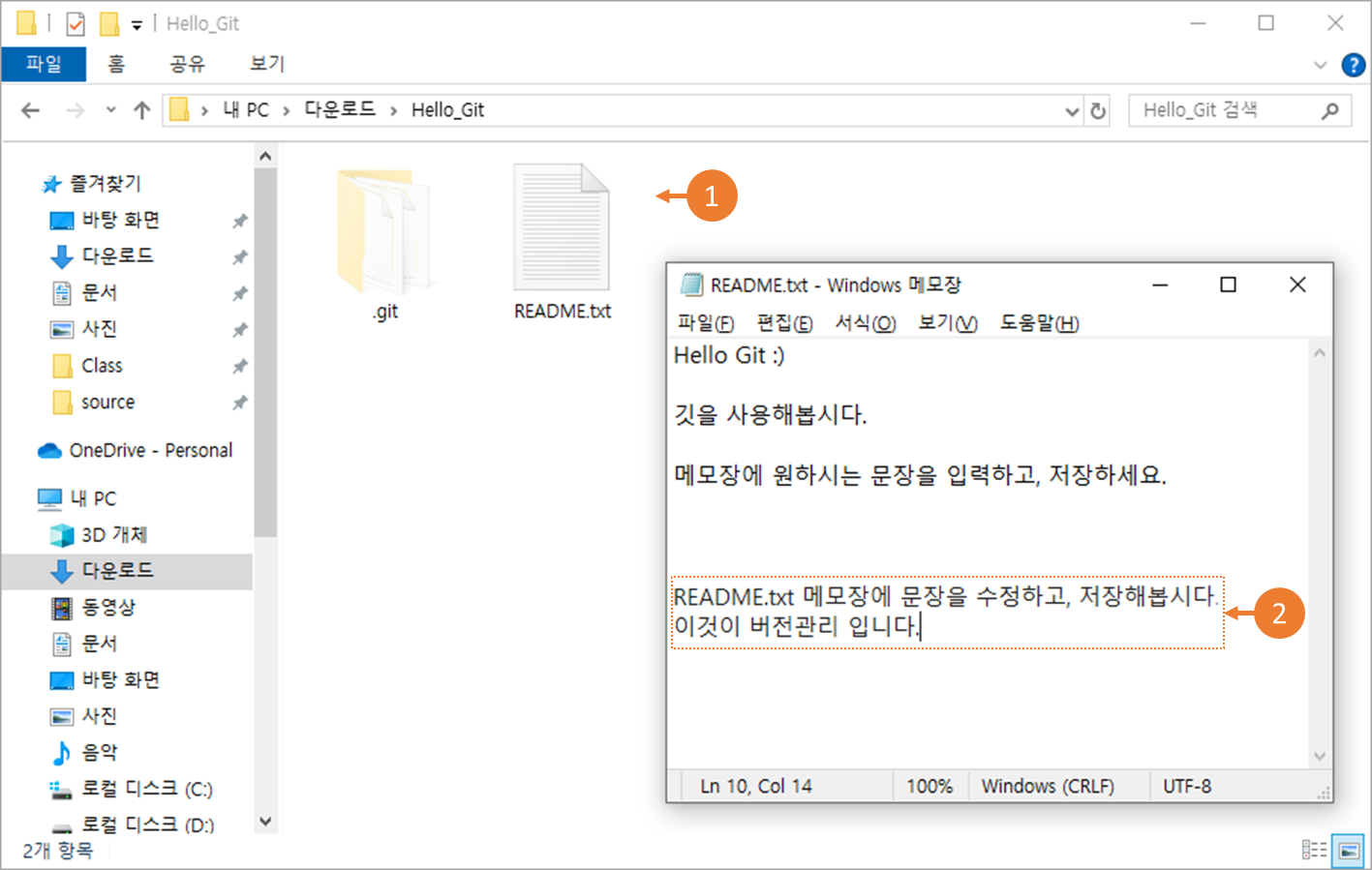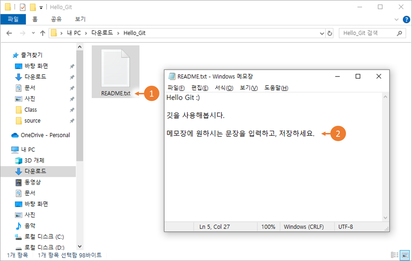①REAME.txt 텍스트 파일을 열고, ②메모장에 원하는 문장을 입력하고, 저장합니다.