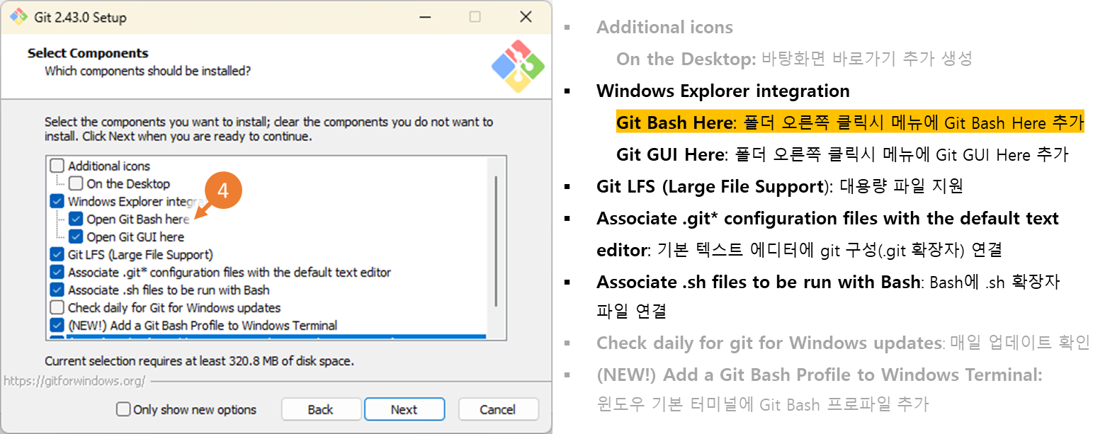깃 설치 과정에서 Open Git Bash Here 설정을 체크하지 않았다면 해당 메뉴가 없습니다.