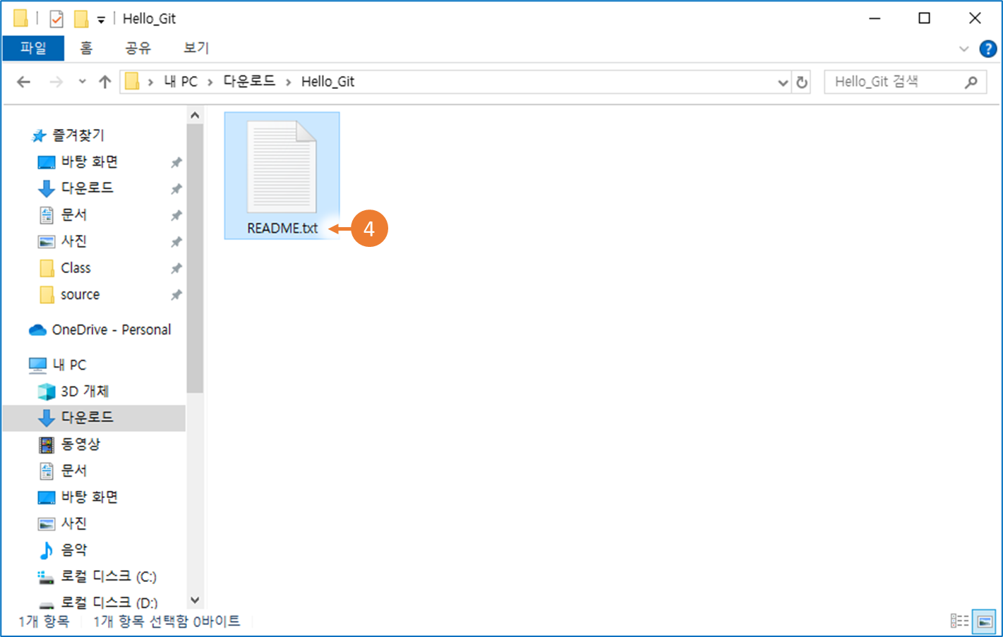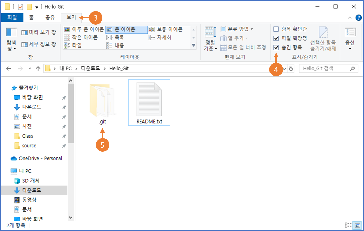 ⑤ <README.txt>파일이 있는 곳에 <. git 폴더>가 생성되어 있음을 확인할 수 있습니다.