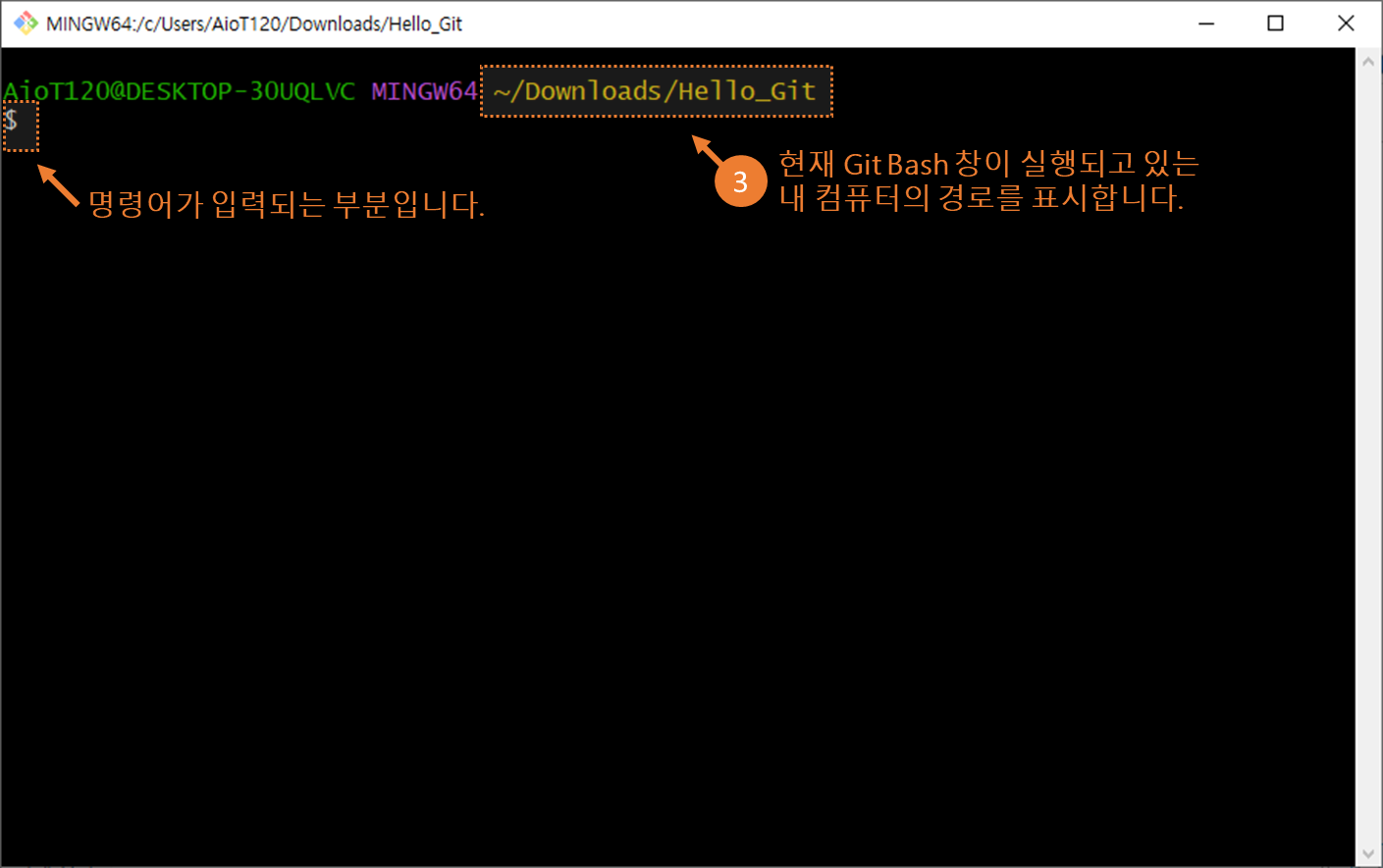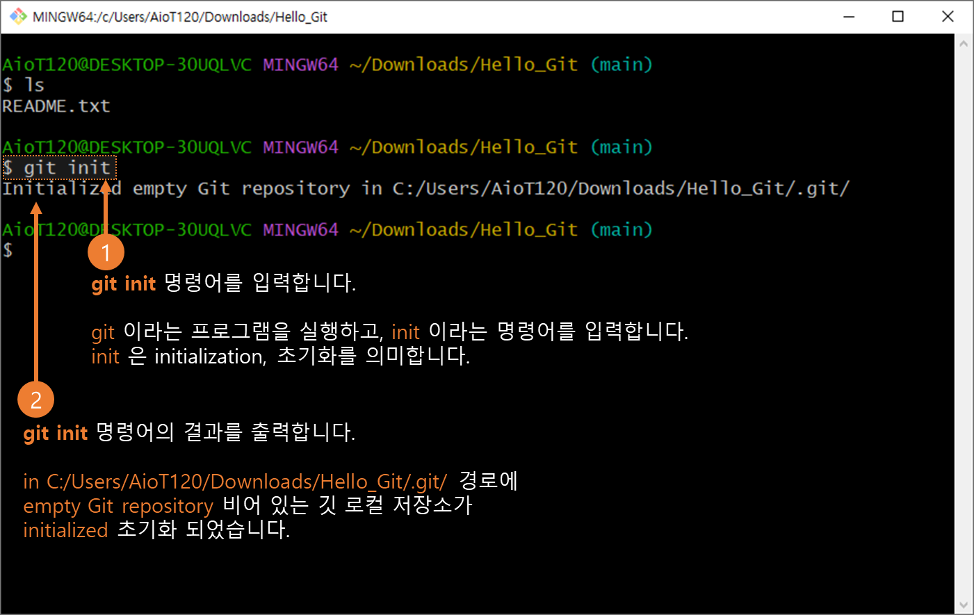 ①Git Bash의 $ 뒤에 명령어를 입력할 수 있습니다. git init 명령어를 입력합니다.