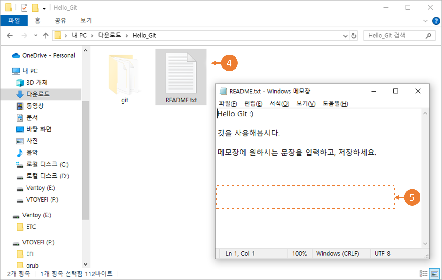 1. <REAME.txt> 메모장에 "추가 문장"을 입력합니다.