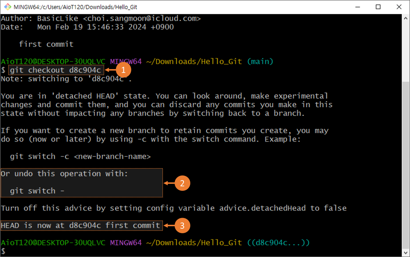 ① git checkout 0x1234 명령어로 과거 commit으로 되돌아갑니다. commit id 7자리를 사용합니다.