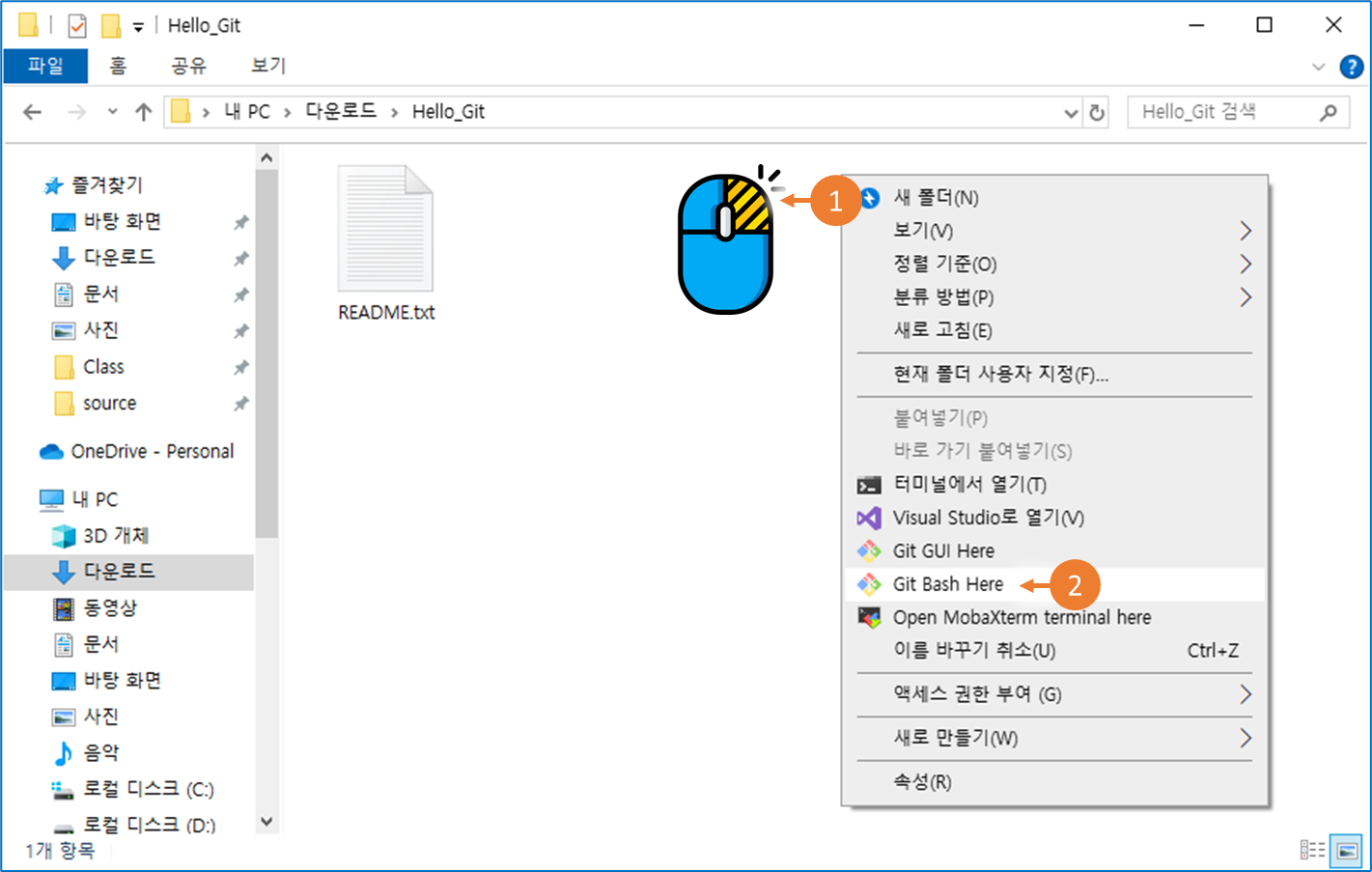 ①원하는 폴더에서 마우스 오른쪽 키를 클릭했을때, ②Git Bash Here을 클릭할 수 있는 메뉴가 보입니다.