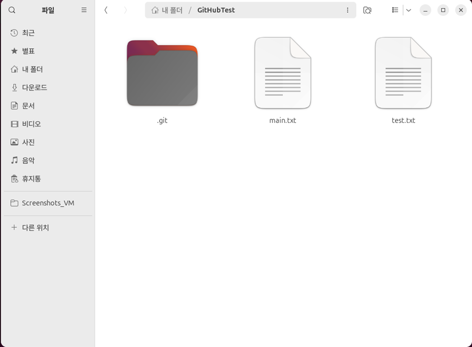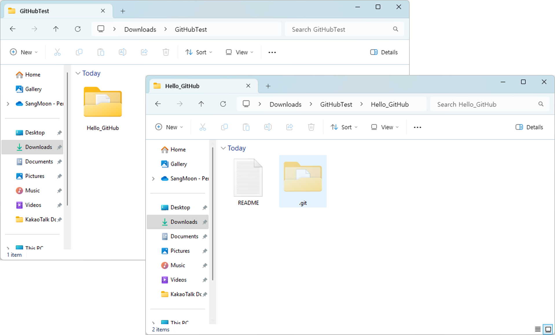 GitHubTest 폴더 내부에, 원격(Remote) 저장소 작업 내용인 Hello_GitHub 폴더가 생성되었습니다.