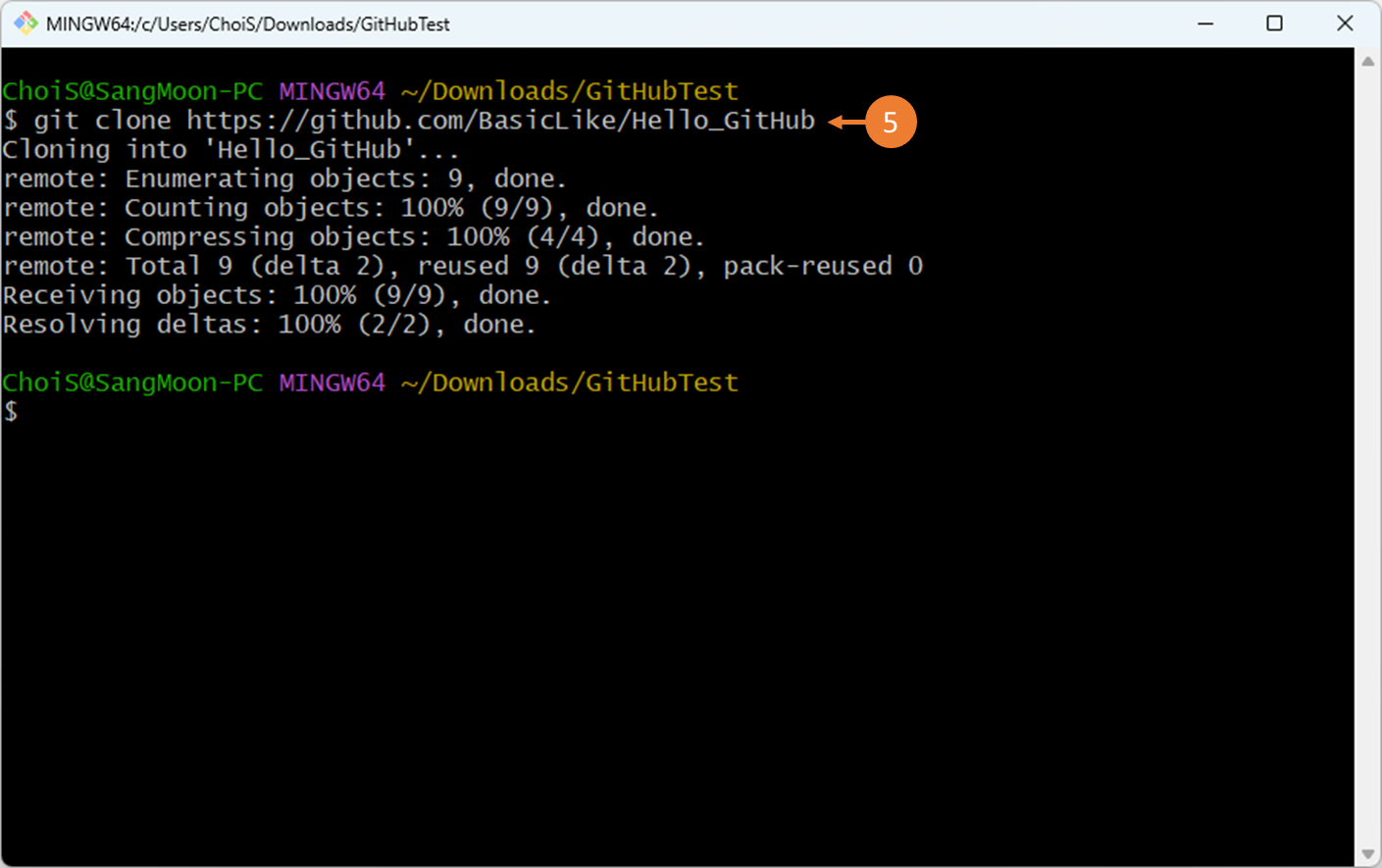 05. git clone 명령어와 원격 저장소 주소를 입력합니다.