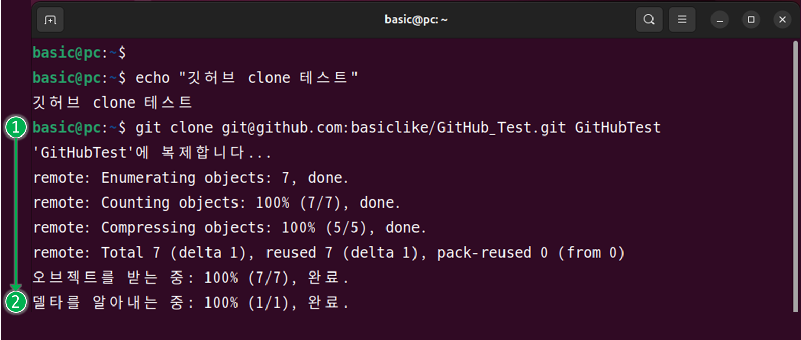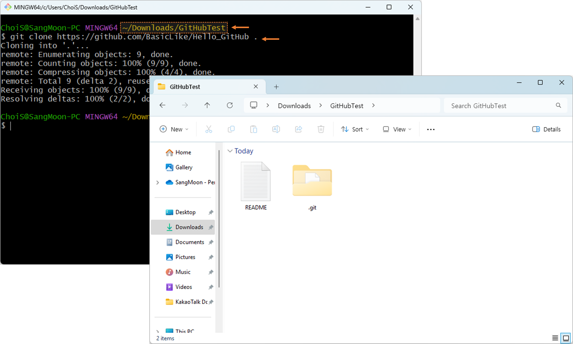 @ git clone 명령어와 원격 저장소 주소를 입력해서 내려받을 때,