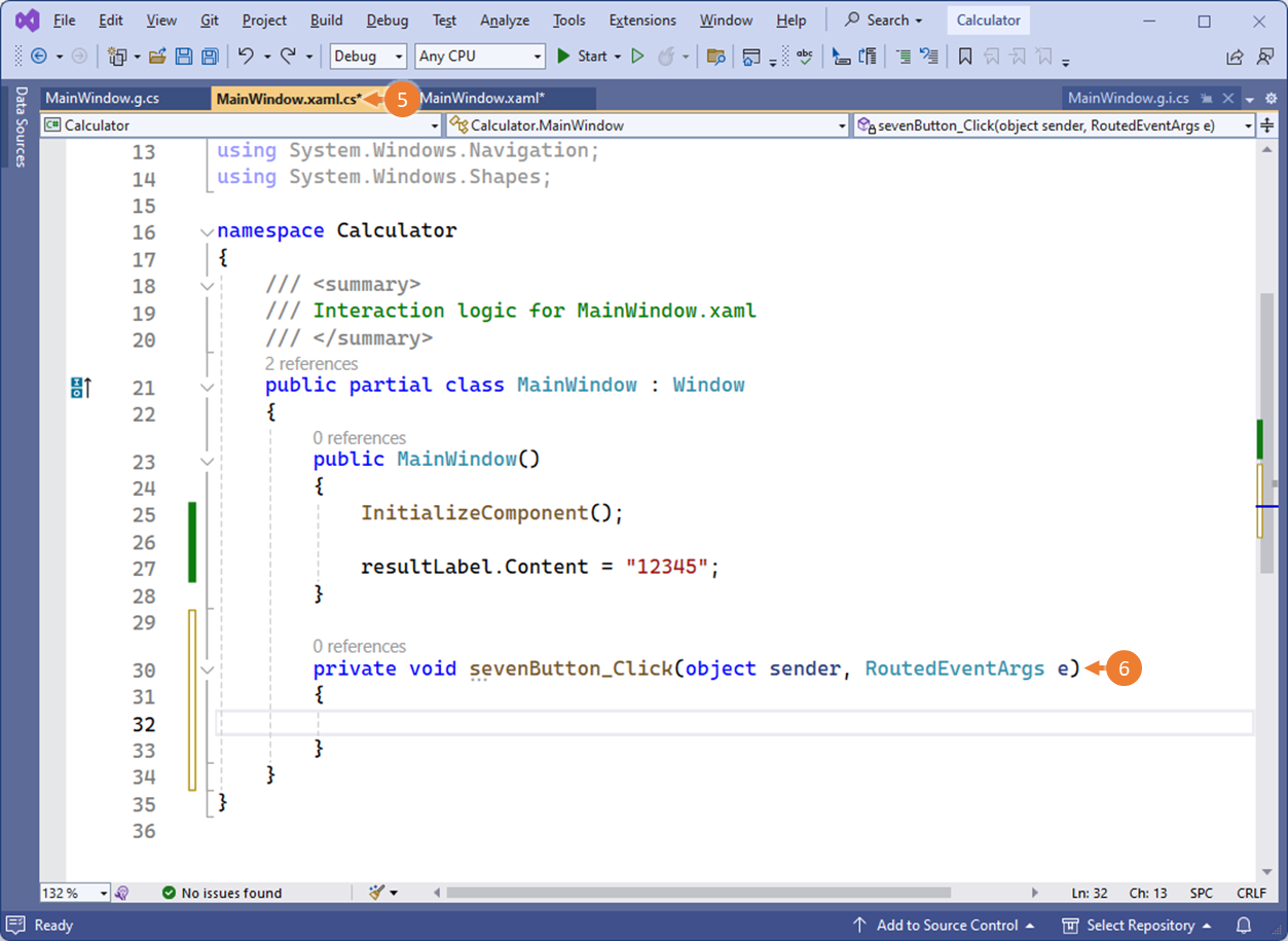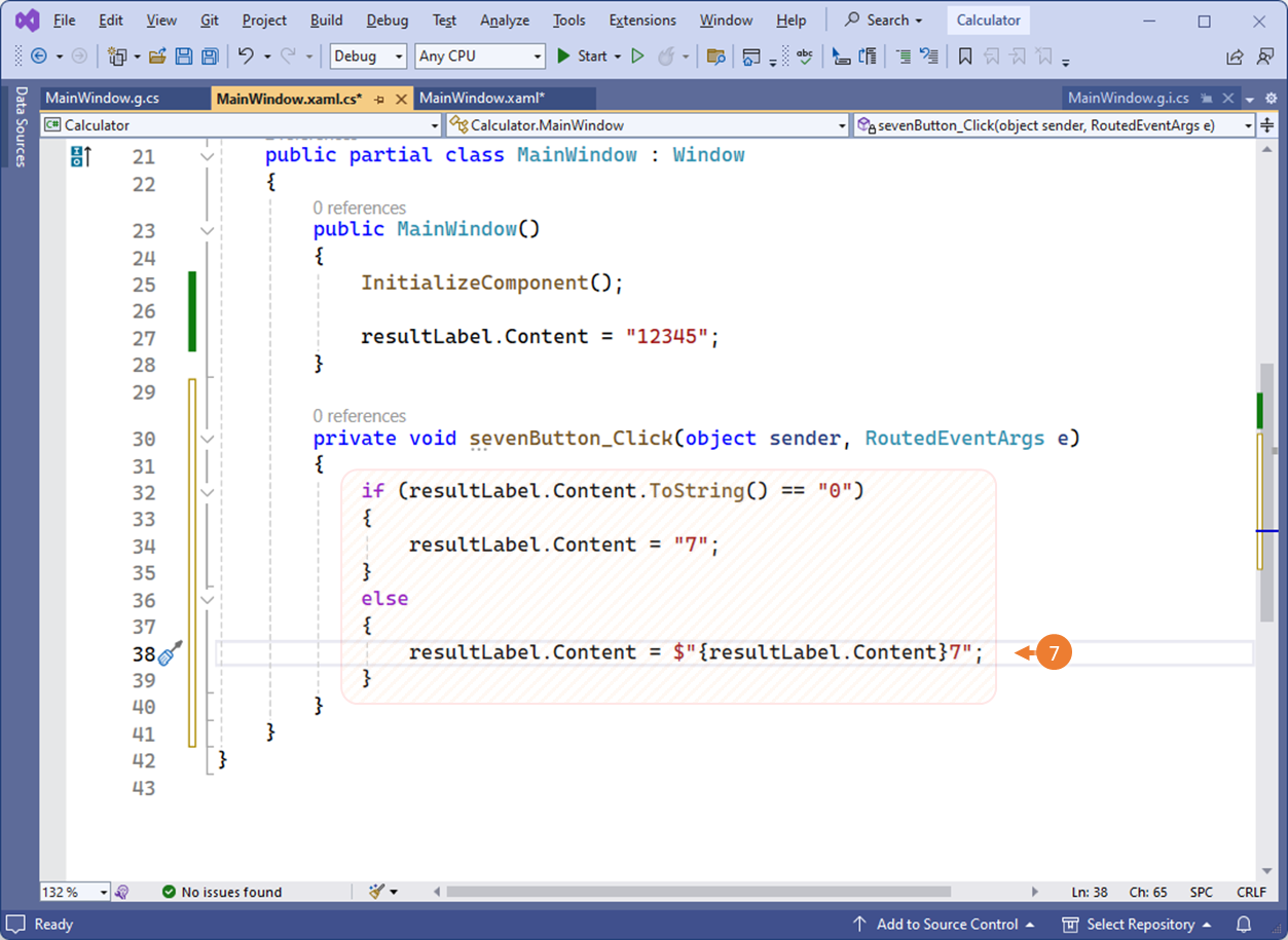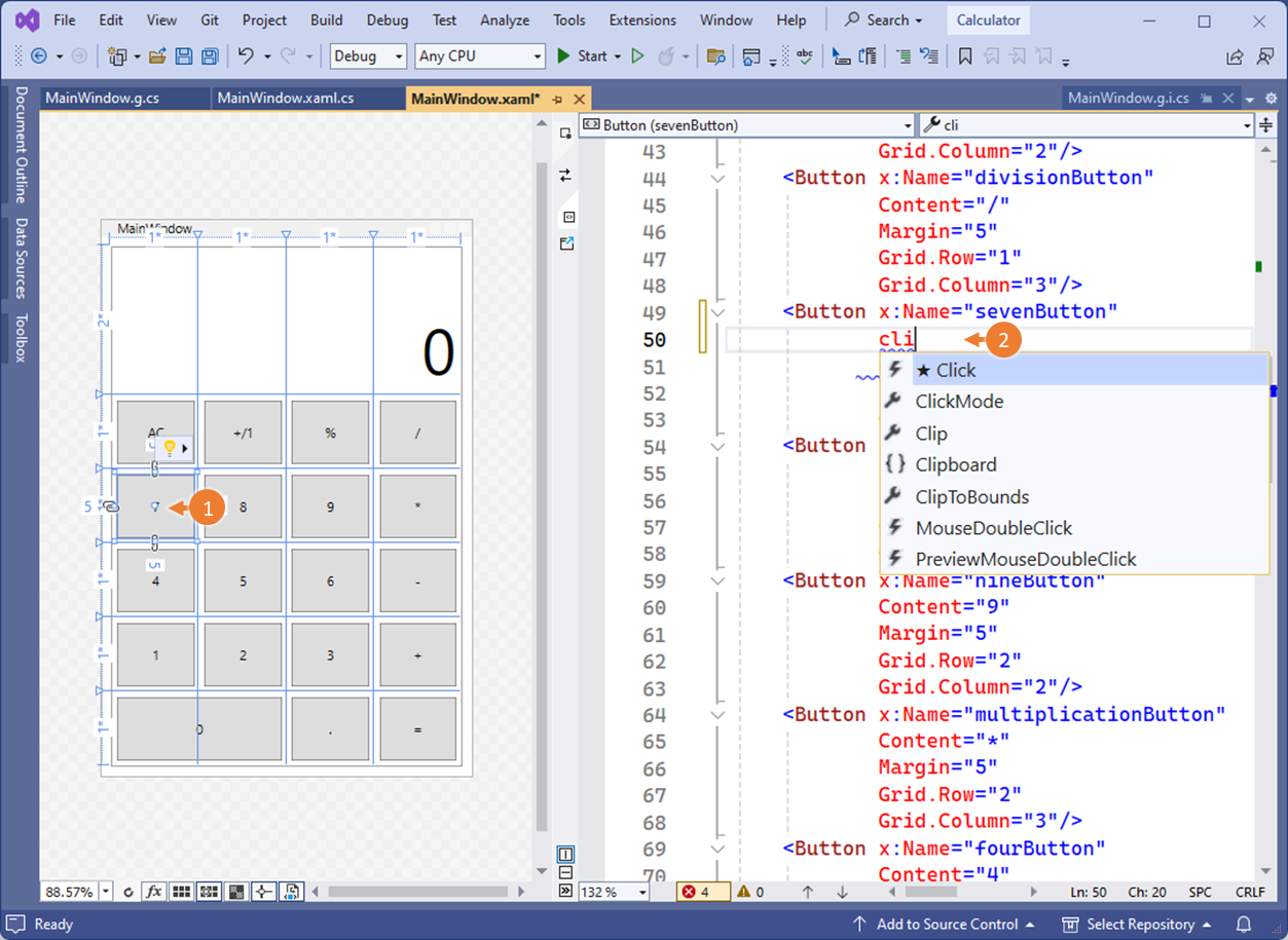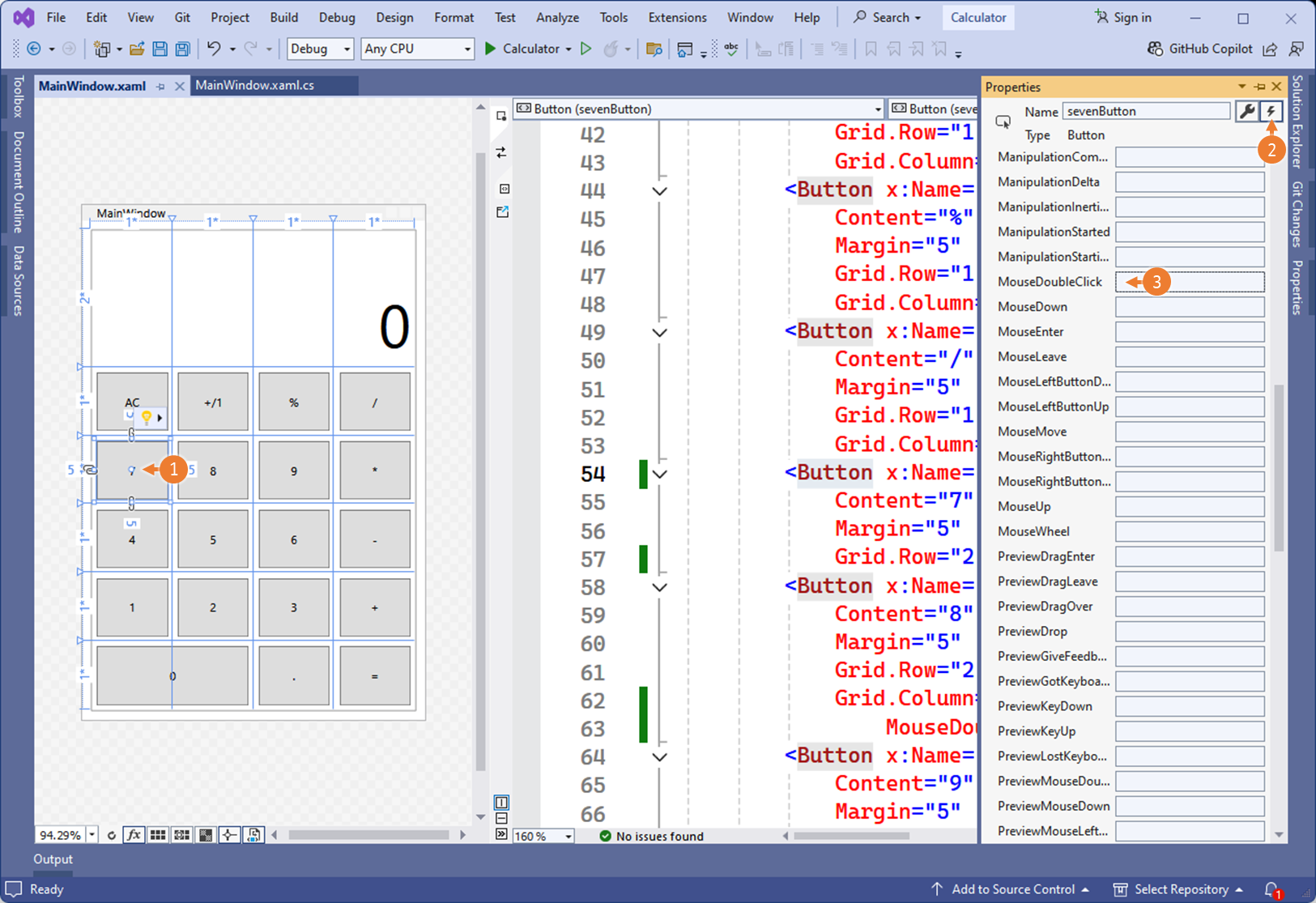 - sevenButton.Click 이벤트에 MainWindows의 sevenButton_Click 이벤트 헨들러가 자동 등록되어 있음을 확인할 수 있습니다.