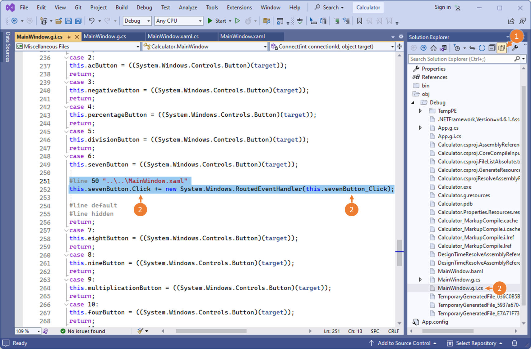- 자동완성된 파일 중 obj > Debug > MainWindows.i.g.cs 파일을 확인해봅시다.