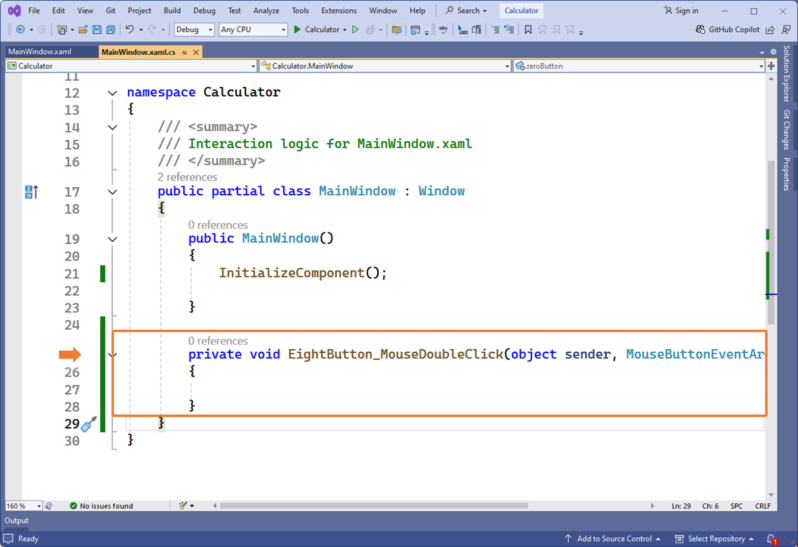 ⑤ MainWindows.xaml.cs 파일로 이동해 자동 완성된 이벤트 핸들러 함수를 확인합니다.