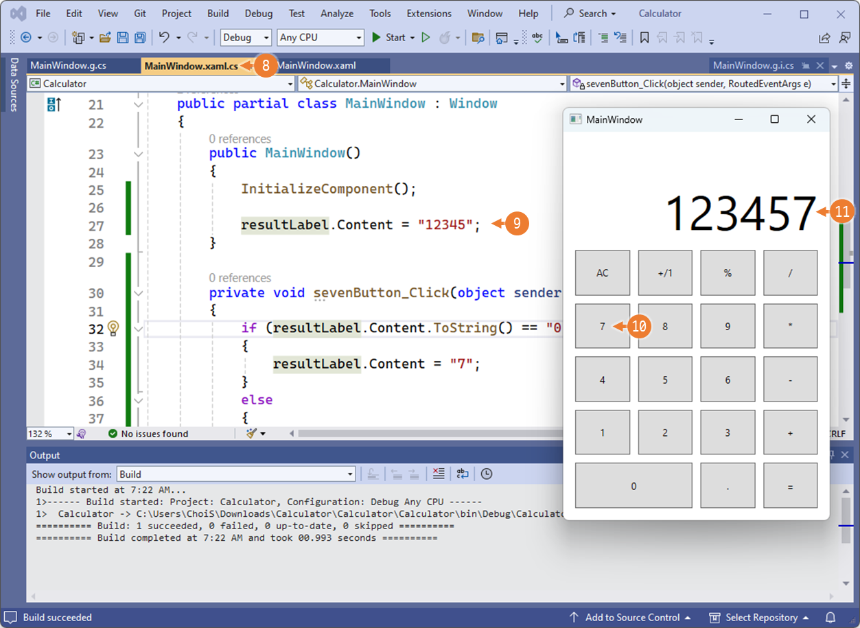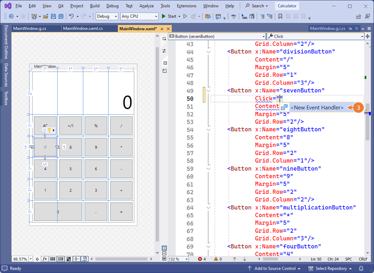 - sevenButton.Click 이벤트에 MainWindows의 sevenButton_Click 이벤트 헨들러가 자동 등록되어 있음을 확인할 수 있습니다.