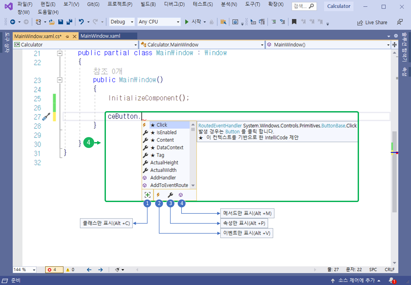 복합 대입 연산자를 입력하면, IntelliSense에서 이벤트 핸들러의 이름을 자동으로 추천해줍니다.