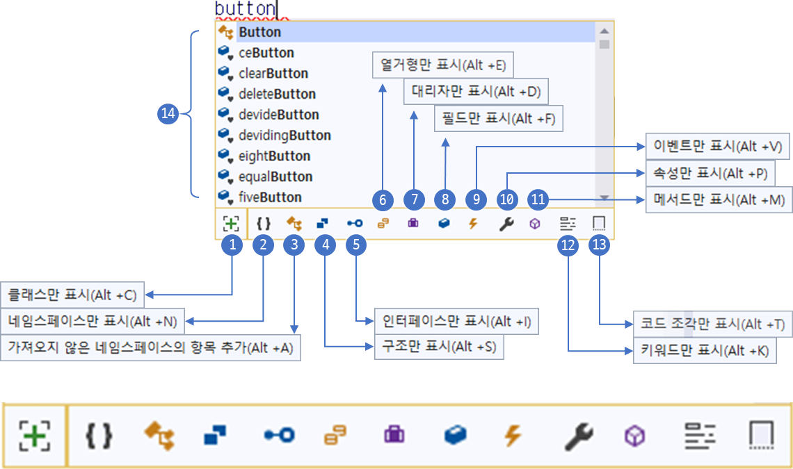 만약 키워드를 button 으로 입력했다면, button 이름 속성이 포함된 모든 컨트롤 리스트가 자동완성에 참조됩니다.