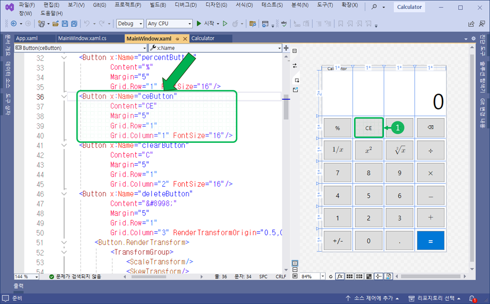 ① XAML에서 ce 버튼에 해당하는 컨트롤을 확인합니다.