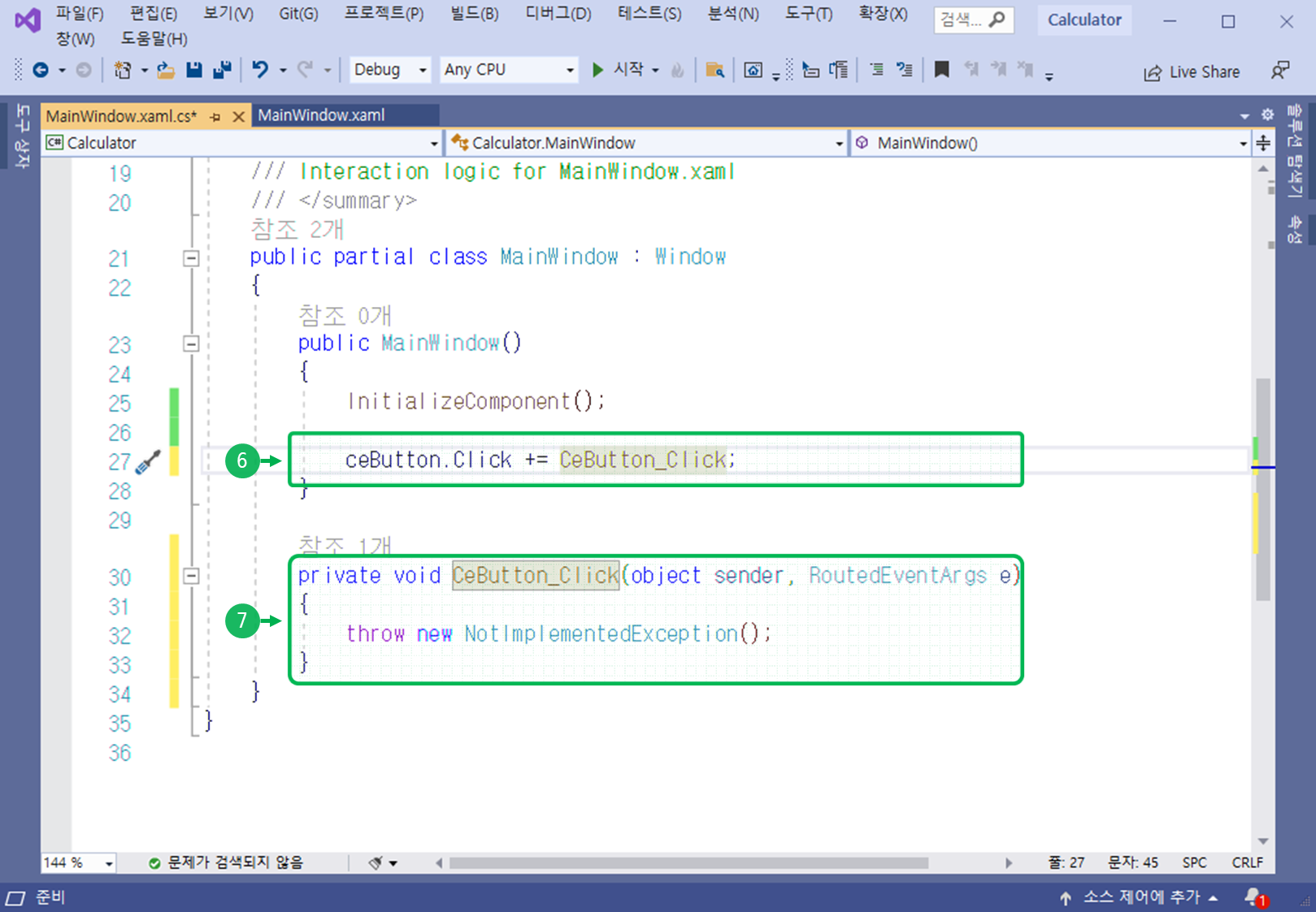 XAML에서 ce 버튼에 해당하는 컨트롤의 식별자(x:Name) 속성값은 “cdButton”로 정의되어 있습니다.