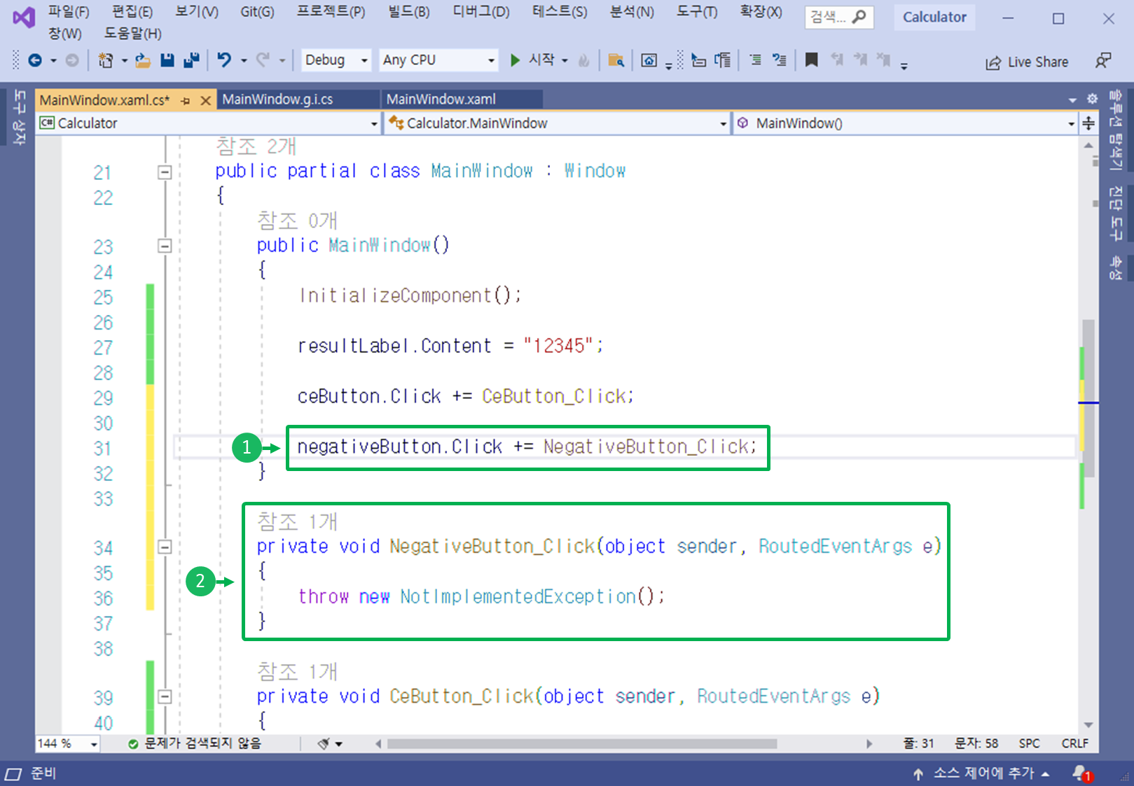 기본적으로 자동 완성된 이벤트 핸들러의 구현부는, 구현이 되지 않은 throw 가 일어나면 프로그램이 종료되도록 예외 처리되어 있기때문에, 구현부를 수정해야 합니다.