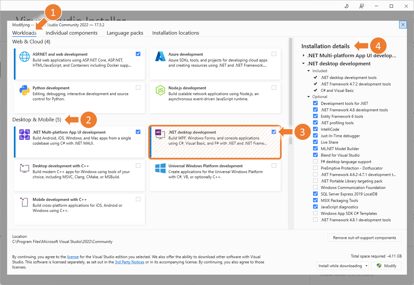 ❹.NET desktop development 선택하면, 우측 상세 정보에서 Visual Studio 버전에 따라 가장 최신 버전의 .NET 이 자동으로 선택되어 있습니다. 필요에 따라 추가 선택, 제외하시면 됩니다.