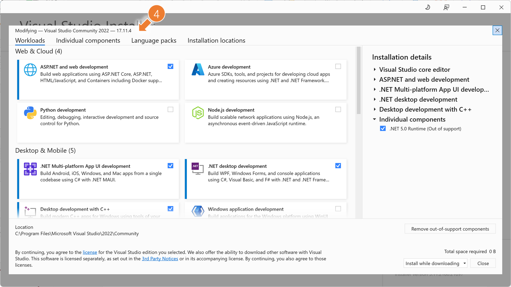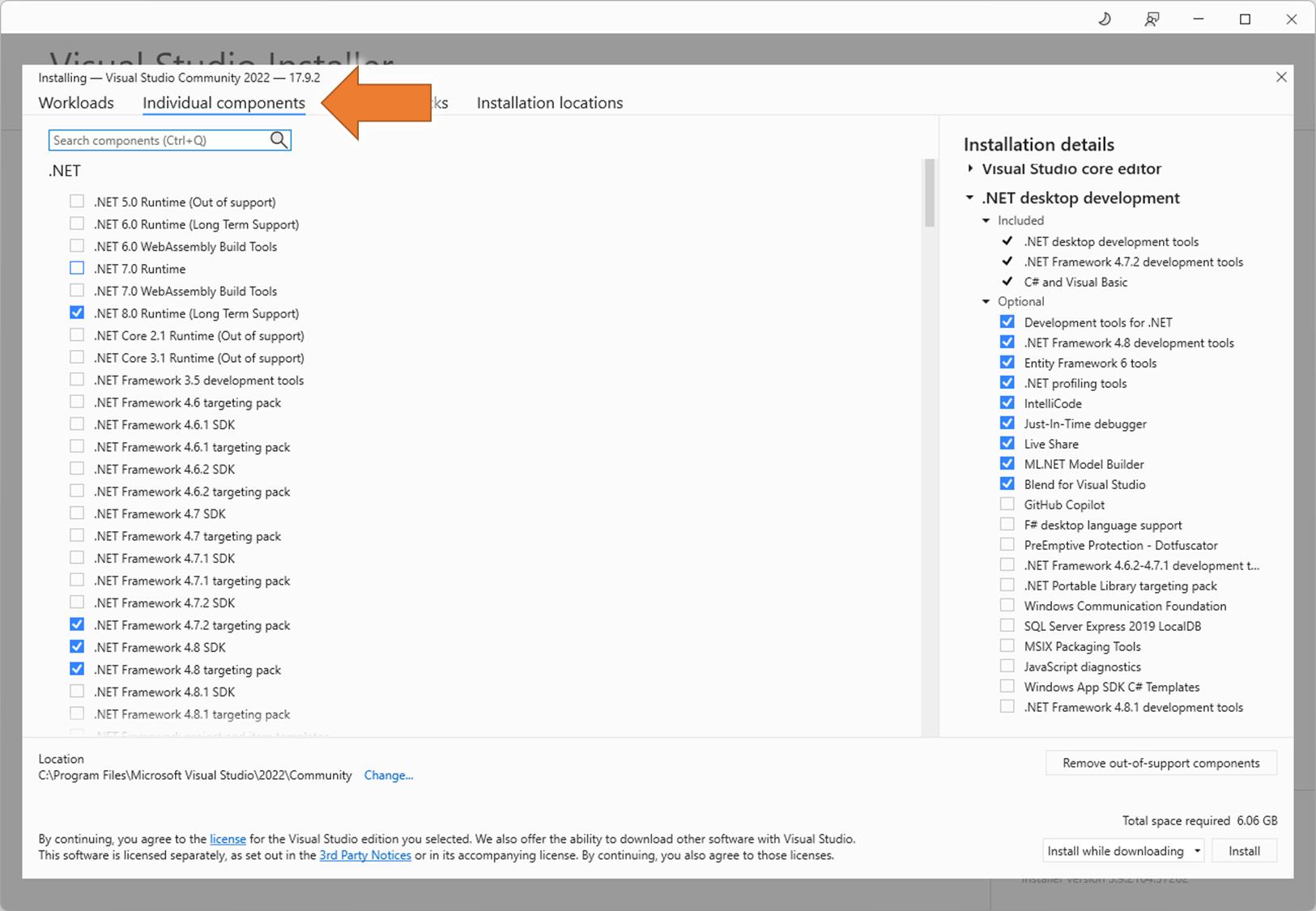 필요한 .NET 버전 및 필요한 라이브러리는 [ Individual components ] 개별 구성 요소 탭에서