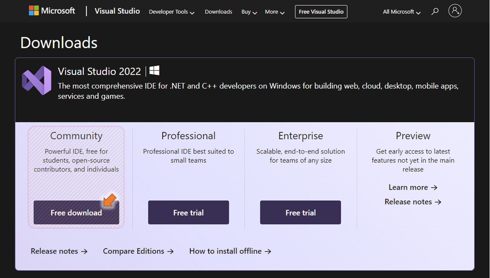 1.1 Visual Studio 2022를 사용하고자 하는 경우, 아래 링크로 이동하여