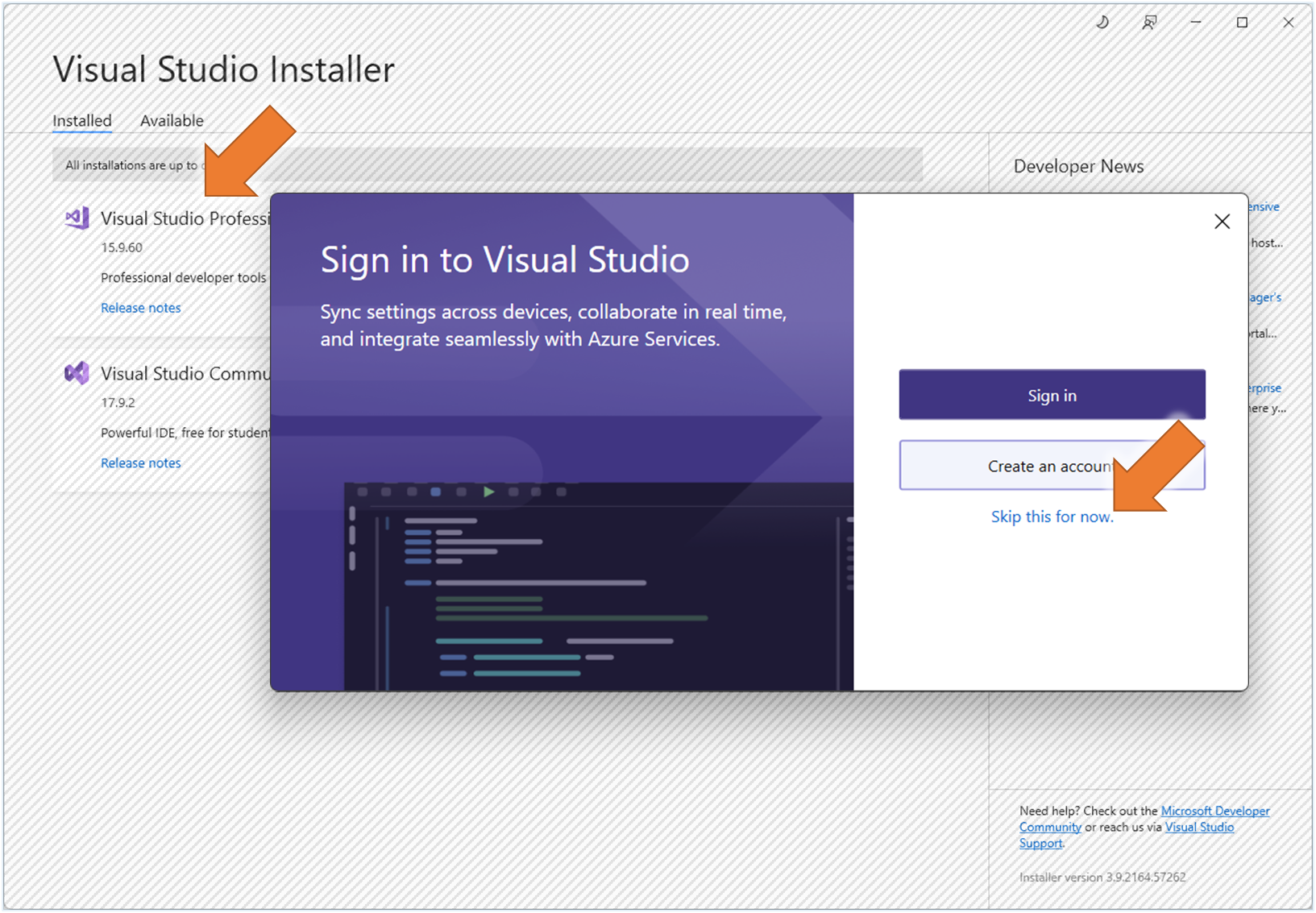 설치가 완료 후, Visual Studio를 실행하면, 아래와 같은 로그인 화면이 보입니다.