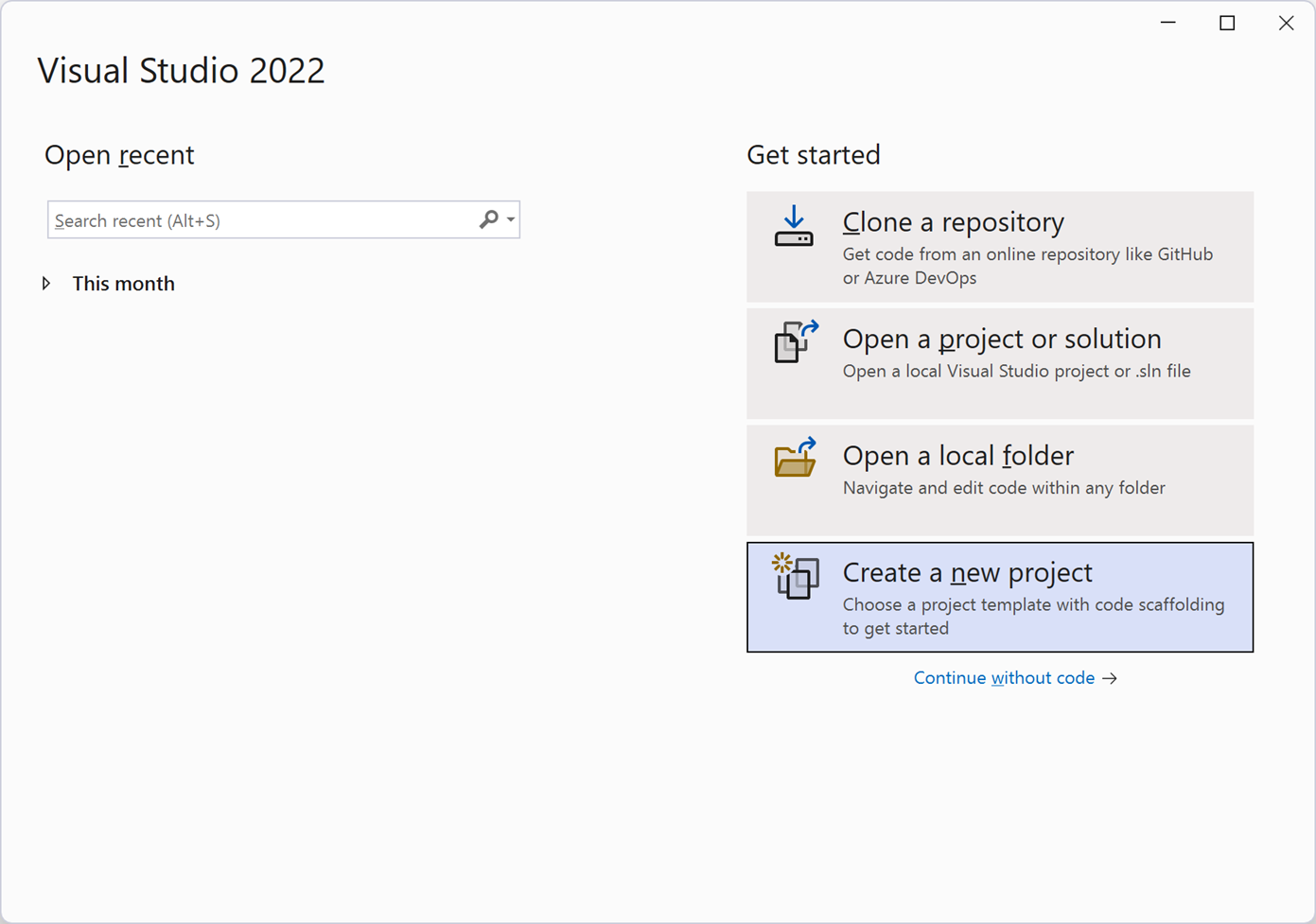 아래 화면은 비주얼 스튜디오 2022를 실행한 초기화면입니다.