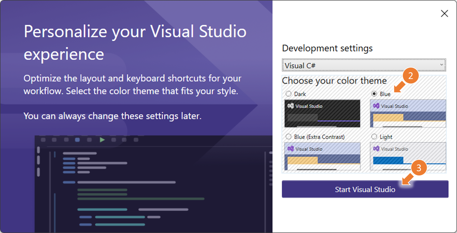 비주얼 스튜디오 테마를 선택하고, 하단의 비주얼 스튜디오 시작 버튼을 클릭합니다.