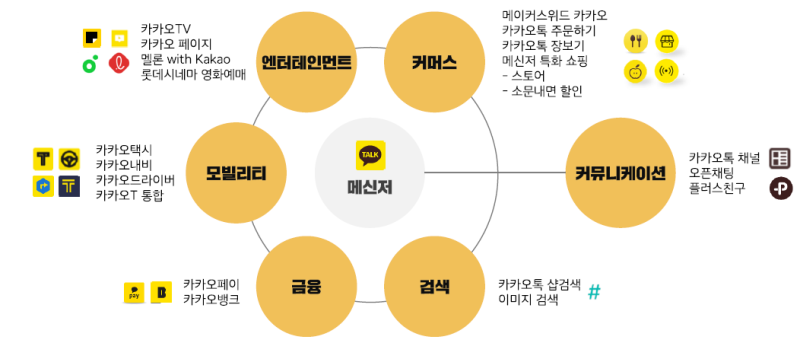 카카오톡도 카카오톡 이용자들에게 카카오톡이라는 서비스를 기반으로 한 카카오뱅크, 카카오택시 등과 같은 카카오 플랫폼 생태계를 구축했습니다.