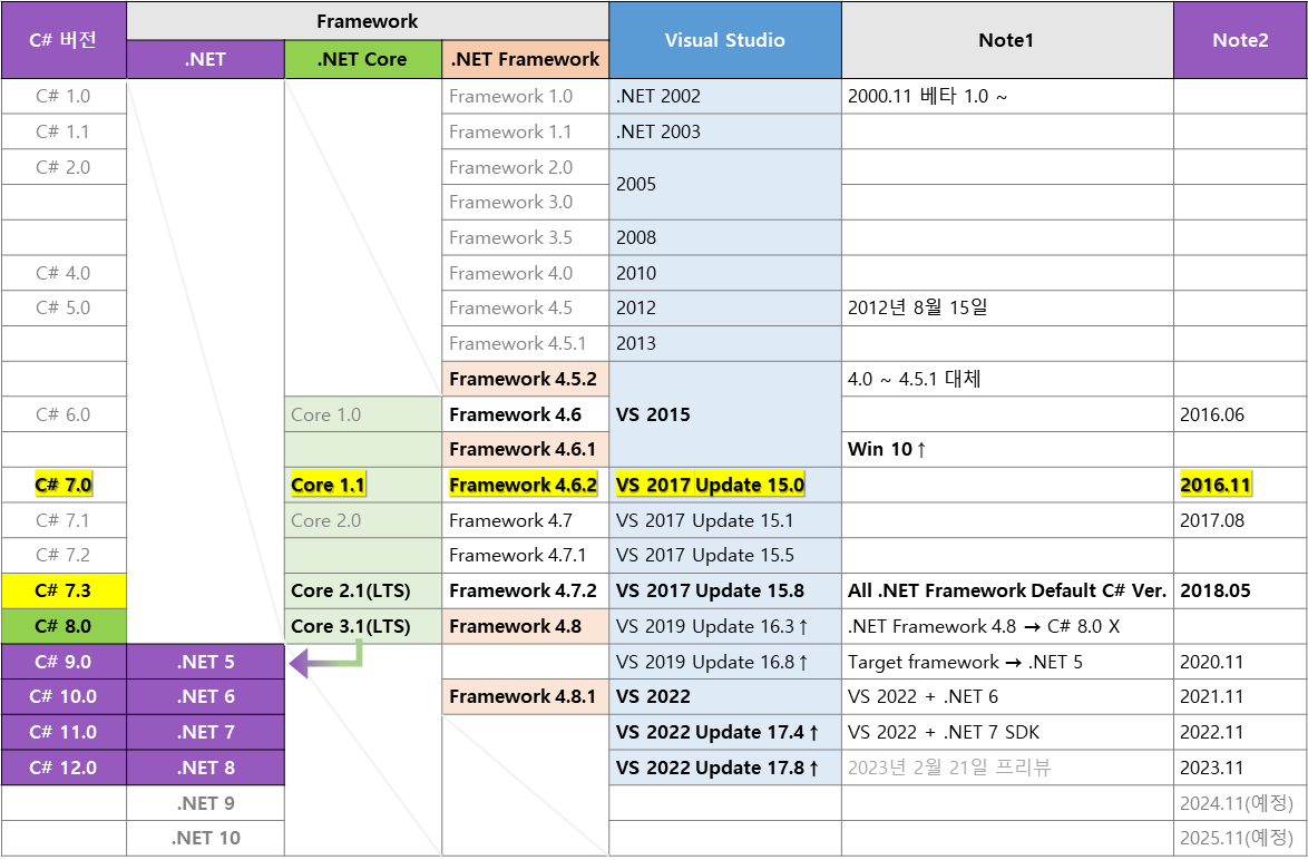 Visual Studio 버전별로 사용 가능한 C# 버전과, .NET 버전이 상이하다.