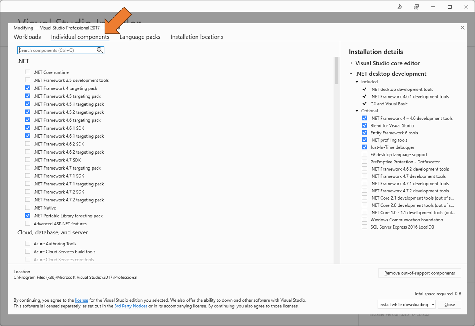 Visual Studio 2017 버전이기 때문에, [ Individual components ] 탭에서 .NET 5, .NET 6 등을 추가 설치 할 수 없다.