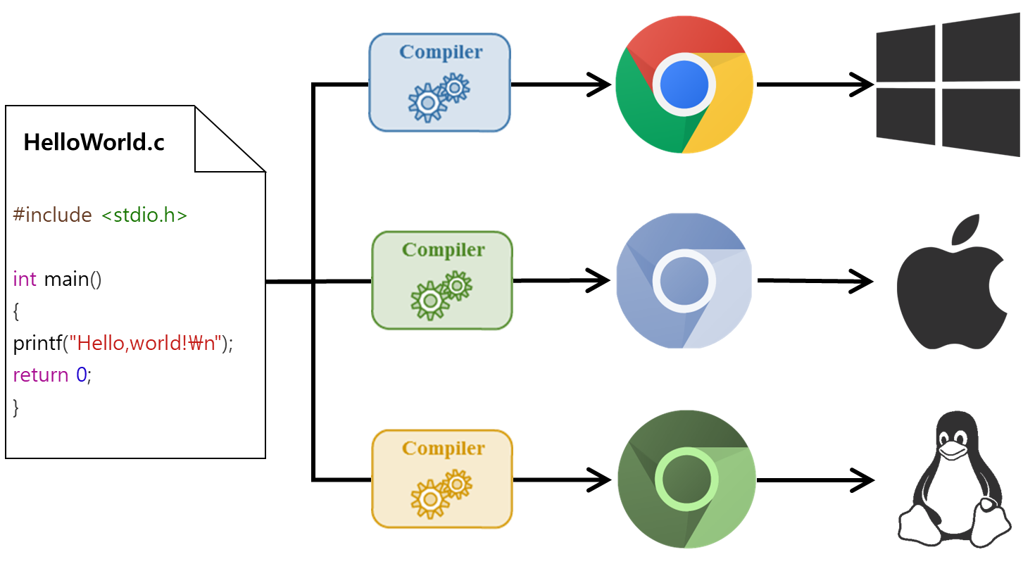 모든 운영체제와 아키텍처에 공통된 기능을 제공하는 애플리케이션을 만든다면, 의운영체제마다, 그리고 아키텍처 별로 프로그램을 개발환경을 다르게 세팅하고 개발해야 합니다.
