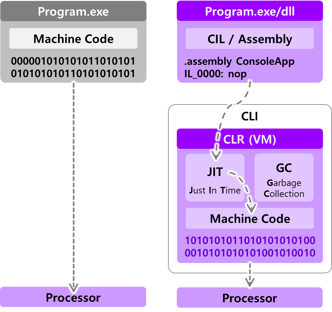어셈블리 형태의 중간 코드는 CLR(Common Language Runtime) 가상머신 위에서 동작할 때, CLR이 IL 중간언어를 CPU가 실행 가능한 기계어로 최종 번역하여 프로그램을 실행합니다.