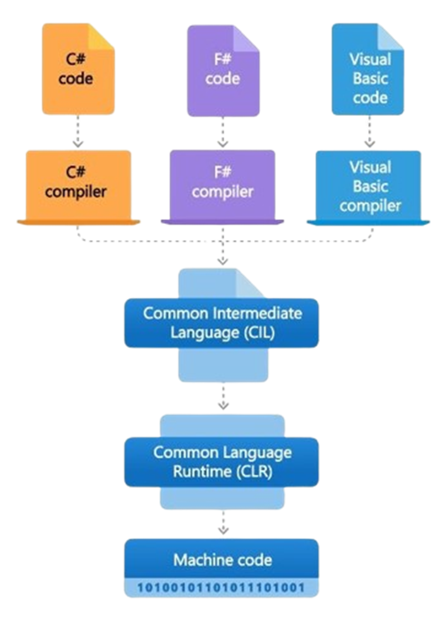닷넷 호환 언어 중 어떤 언어라도 빌드 결과물로 중간 언어로 된 어셈블리를 생성해 낸다면, 닷넷 프레임워크 가상머신이 그것을 실행할 수 있습니다. 이처럼 중간언어로 변역하는 언어를 닷넷 호환 언어(.NET Compliant Language) 라고 합니다.