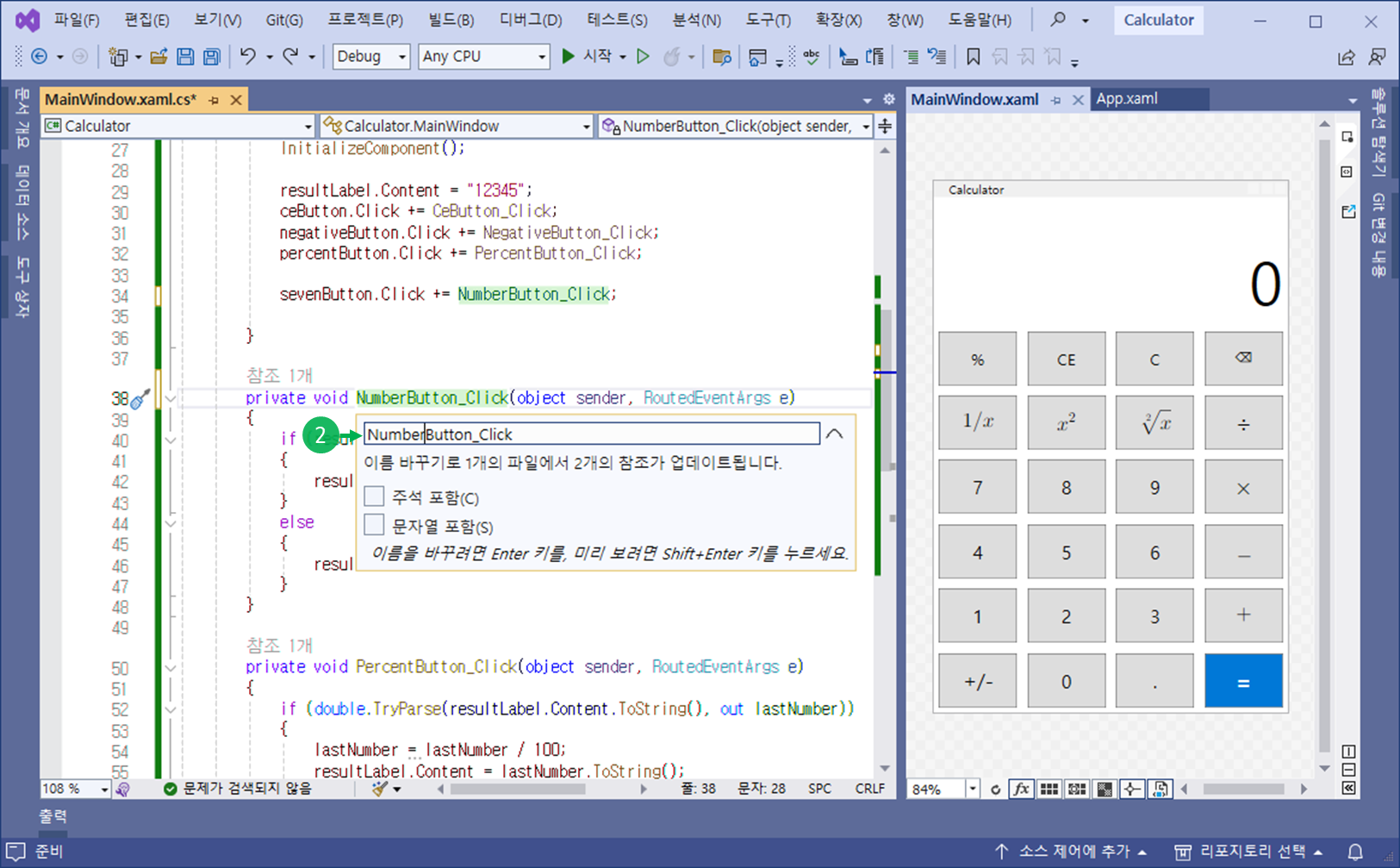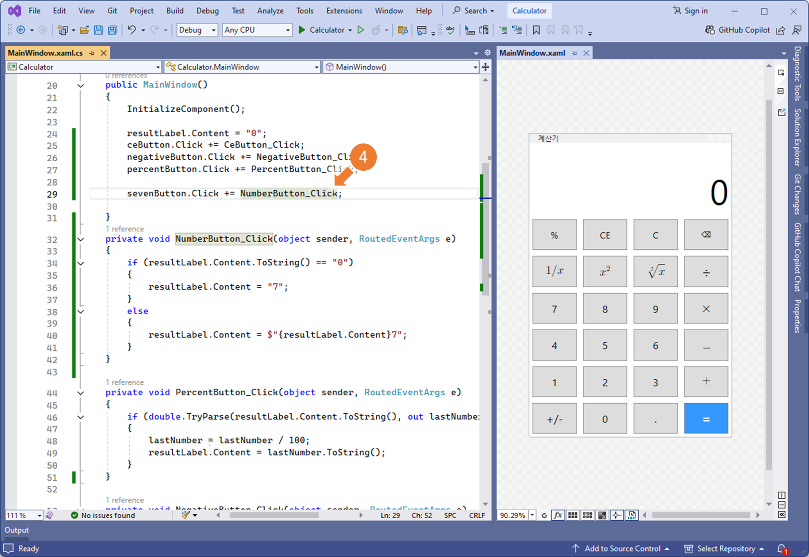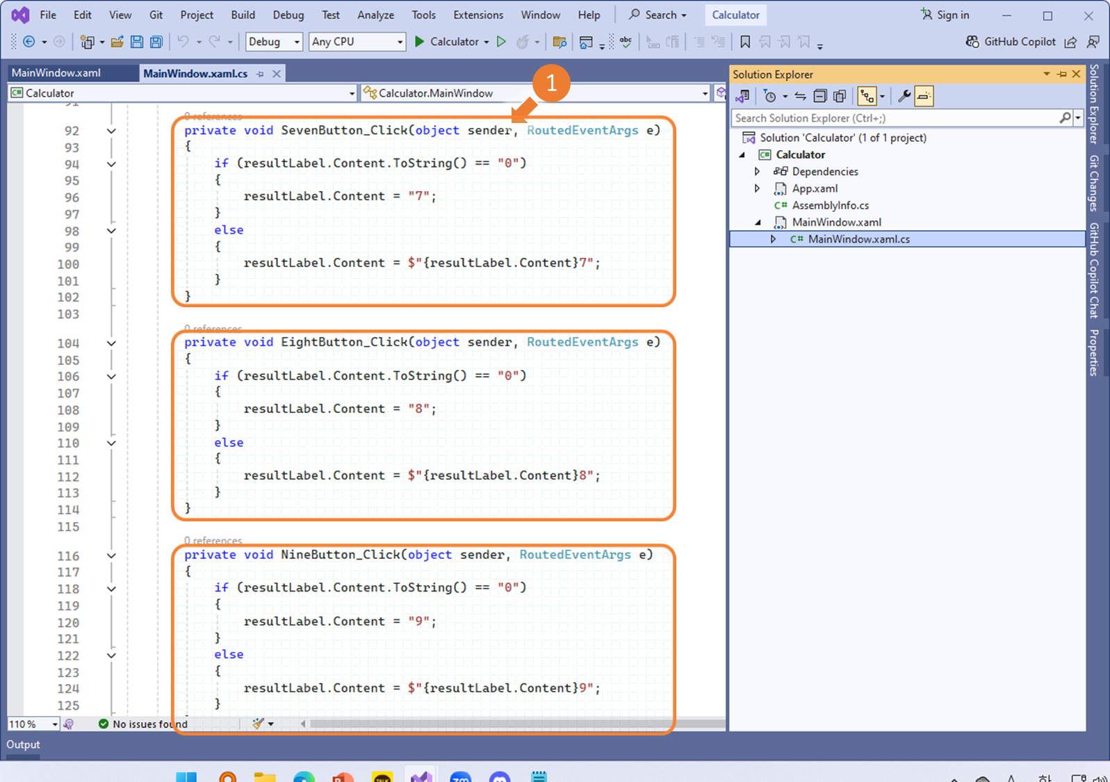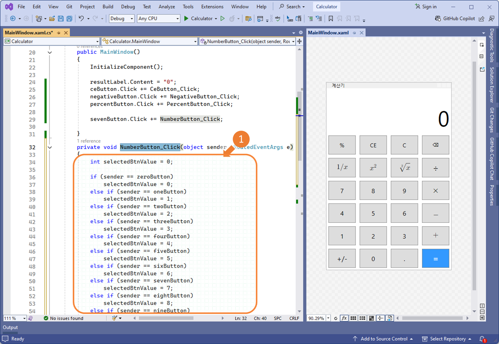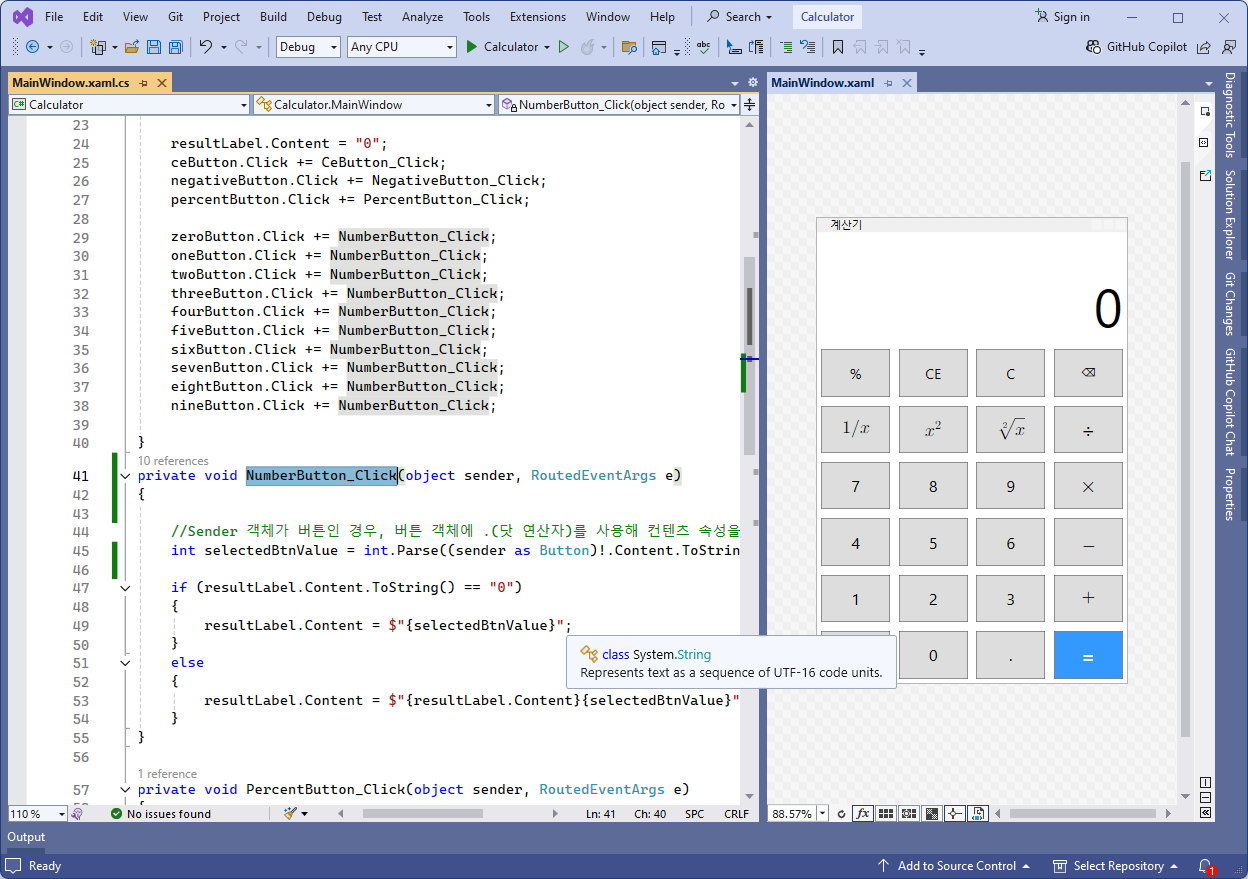 ② XAML의 모든 숫자(0~9) 버튼에 공통으로 적용할 로직 NumberButton_Click 이벤트 핸들러를 정의합니다.