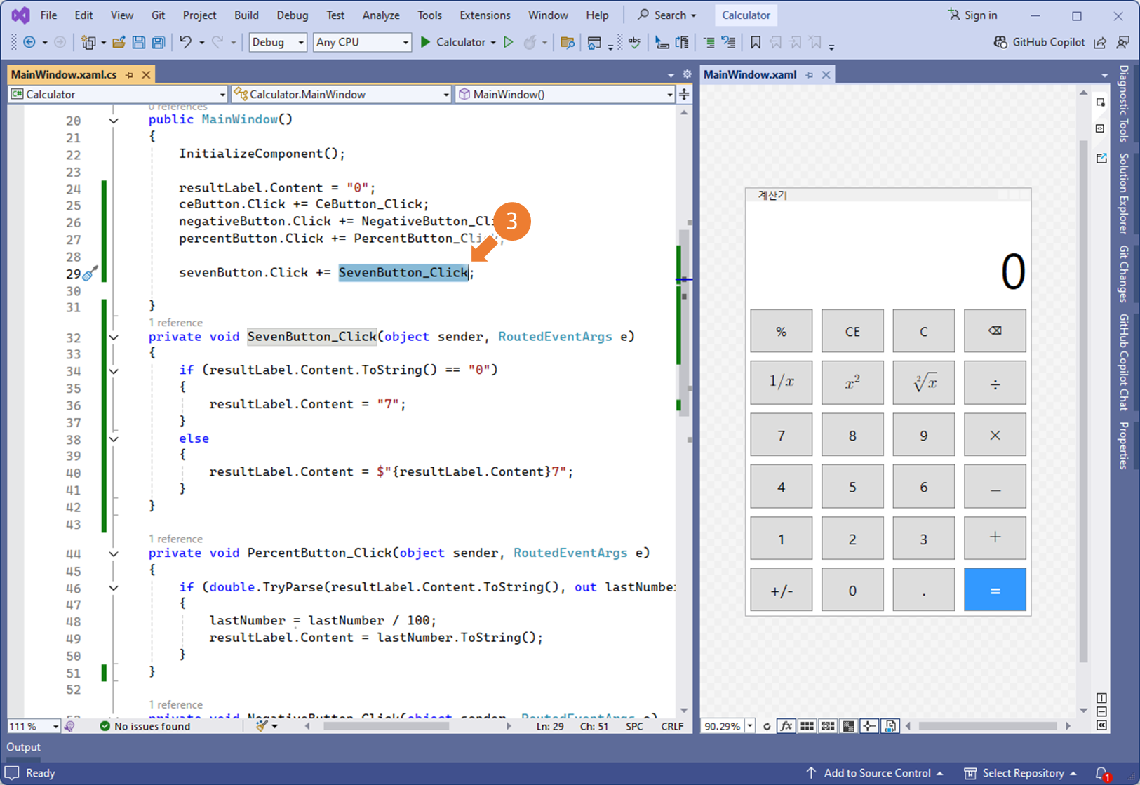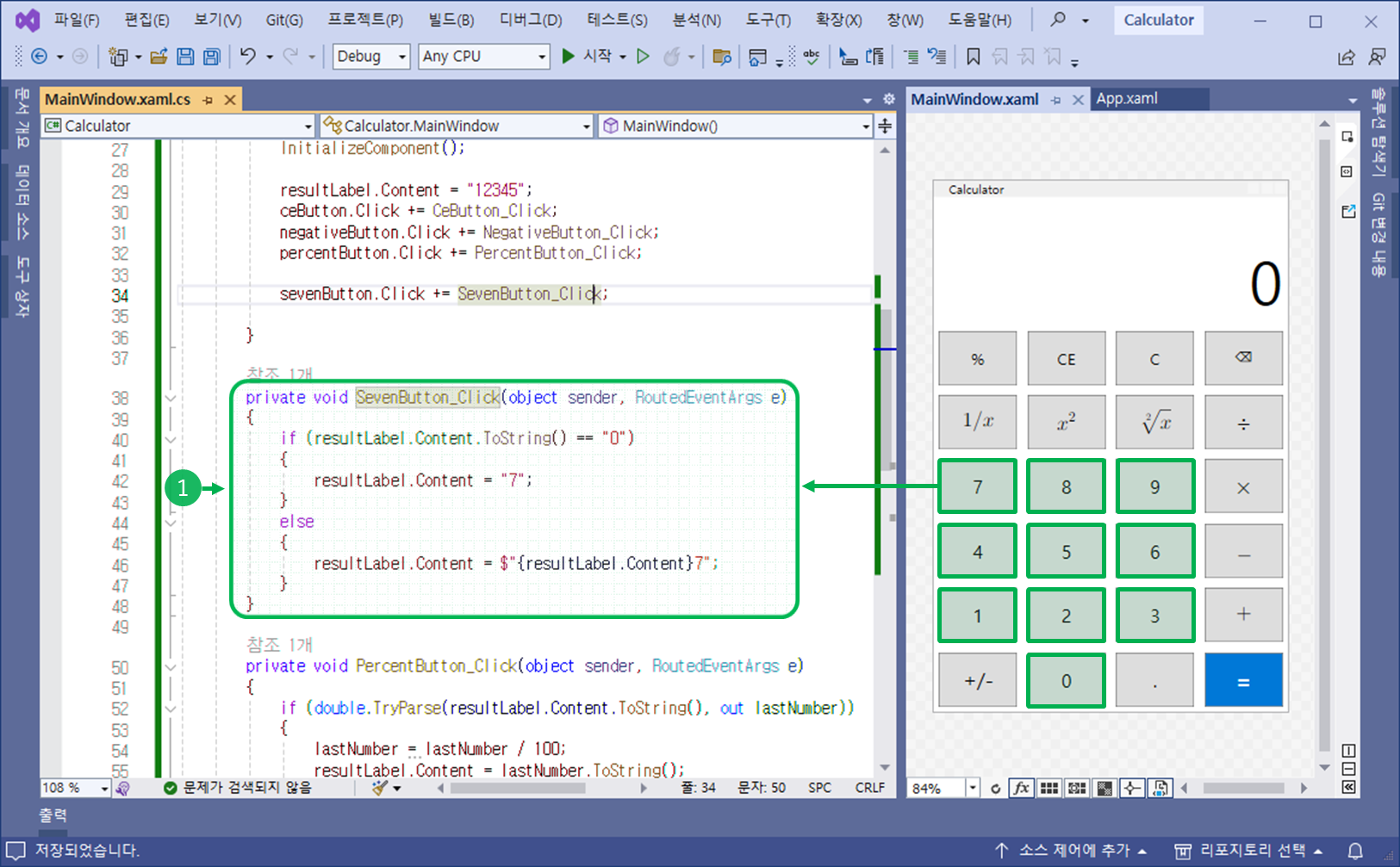 ④ 기존 SevenButton_Click 이벤트 핸들러를 변경합니다.