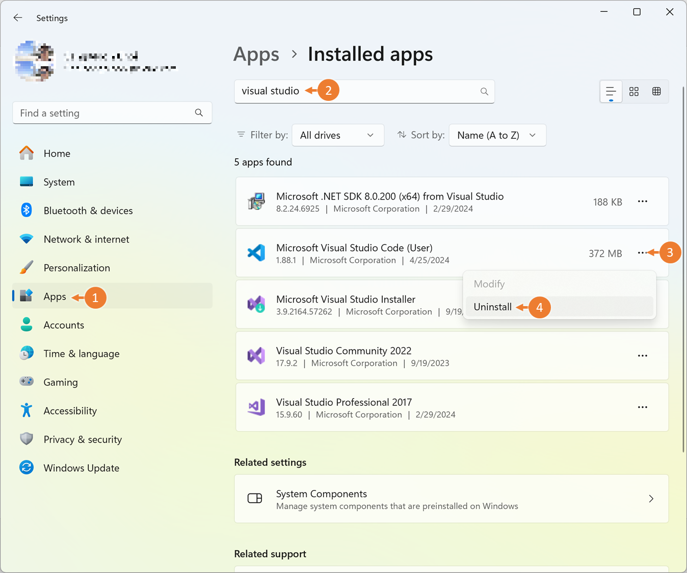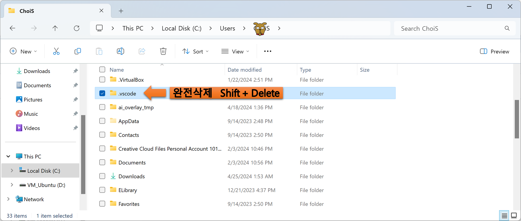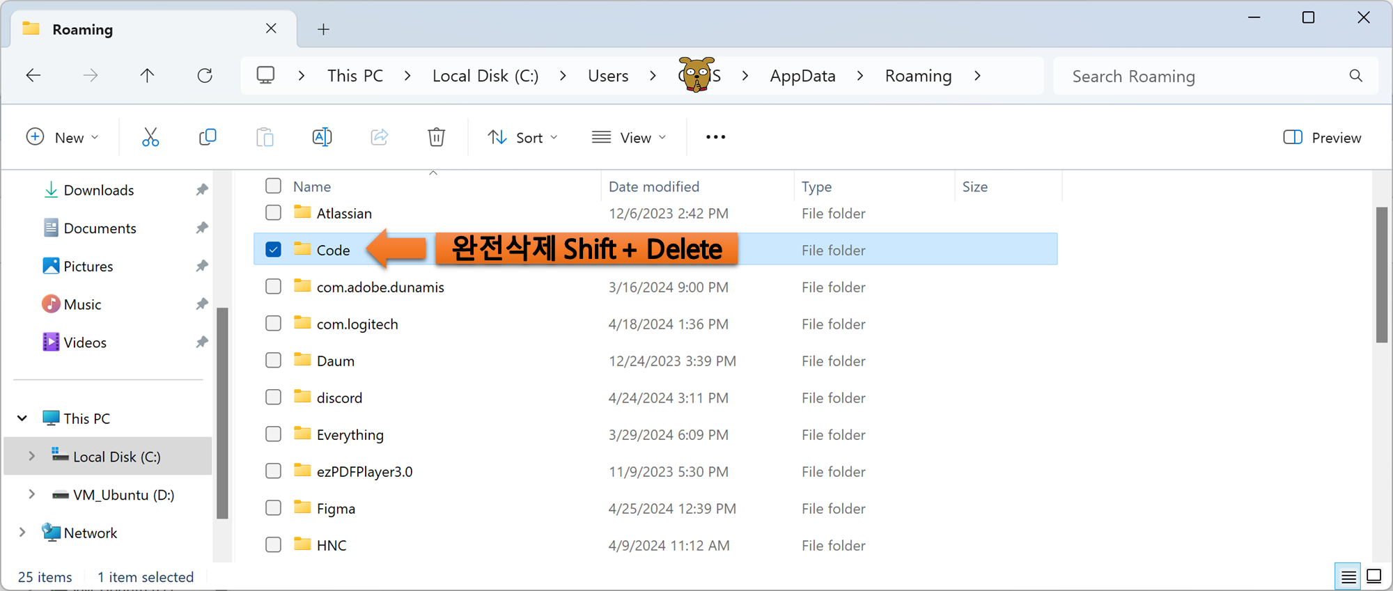 <Win>VSCode, C/C++ 제거 2024.05.13 01:16 C, C++/Setup&Tips 728x90 Uninstall Visual Studio Code Step 1. VSCode 프로그램 삭제 Step 2. %APPDATA%\Code 삭제 C:\Users\사용자\AppData\Roaming Step 3. %USERPROFILE%\.vscode 삭제 C:\Users\사용자 Step 5. MinGW-w64 삭제 공유하기 게시글 관리 BasicLike 댓글 공유하기 다른 글 댓글 이 글 공유하기 구독하기 구독하기 카카오톡 카카오톡 라인 라인 트위터 트위터 Facebook Facebook 카카오스토리 카카오스토리 밴드 밴드 네이버 블로그 네이버 블로그 Pocket Pocket Evernote Evernote 다른 글 <WSL>VSCode, Debug 환경설정 <WSL>VSCode, Debug 환경설정 2024.05.17 <WSL>VSCode, Git, GitHub 환경설정 <WSL>VSCode, Git, GitHub 환경설정 2024.05.15 <Win>VSCode, C/C++ 환경설정 <Win>VSCode, C/C++ 환경설정 2024.05.13 <WSL>VSCode, C/C++ 제거 <WSL>VSCode, C/C++ 제거 2024.05.03 다른 글 더 둘러보기