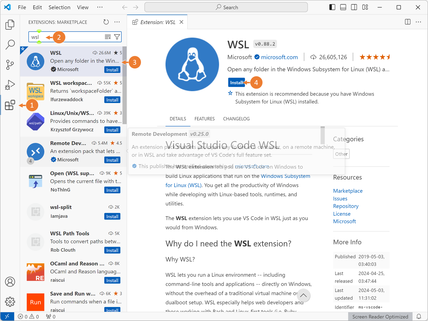 02. 자동으로 WSL Extention 설치 안내가 팝업되지 않는다면, 확장 프로그램 관리에서 검색하여 설치합니다.